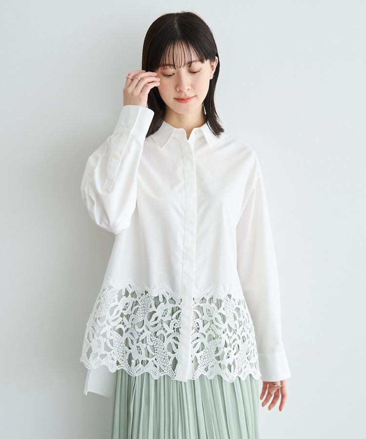 裾レースで魅せるモードなロングシャツ裾のレースが目を惹くロングシャツ。繊細なスカラップレースを使用した春らしい一枚です。後ろが長めのヘムデザインで腰.. |