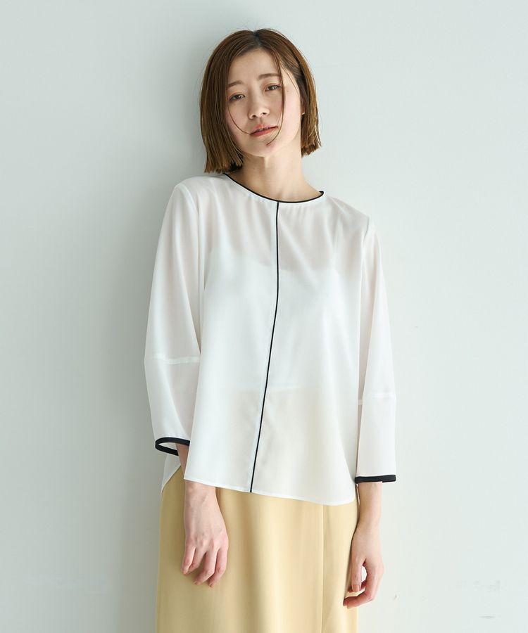 配色ラインが引き立てる、さりげない存在感すっきりとした配色パイピングが目を惹くブラウス。シンプルなデザインの中にライン使いで程よいアクセントを加え、.. |
