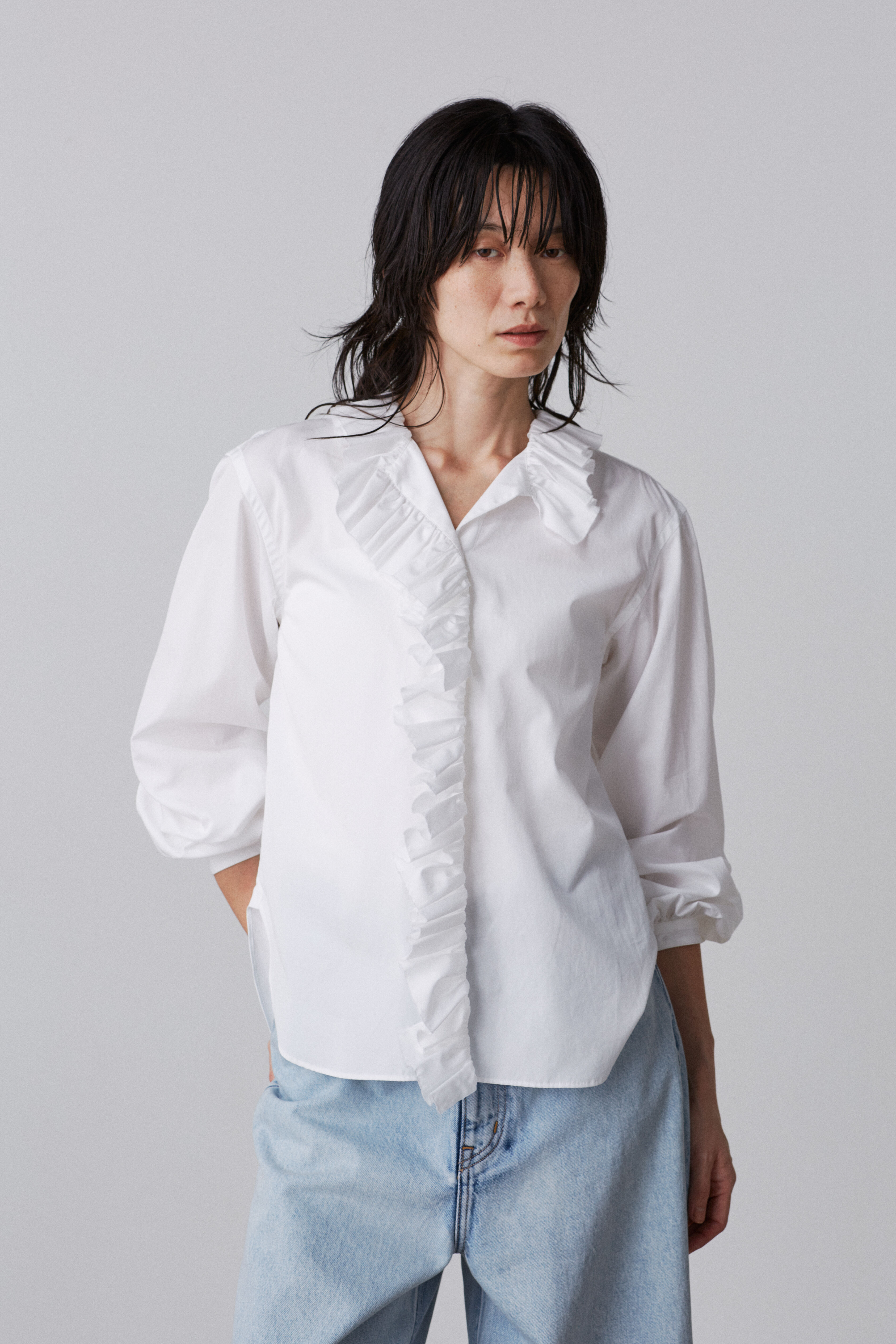 上質な細番手の高密度なタイプライターを使用し、ラッフル端は職人による手裂きで味わいのある風合いです。アイテム名はNAMI/波、ラッフルの形状と動きを表し.. |