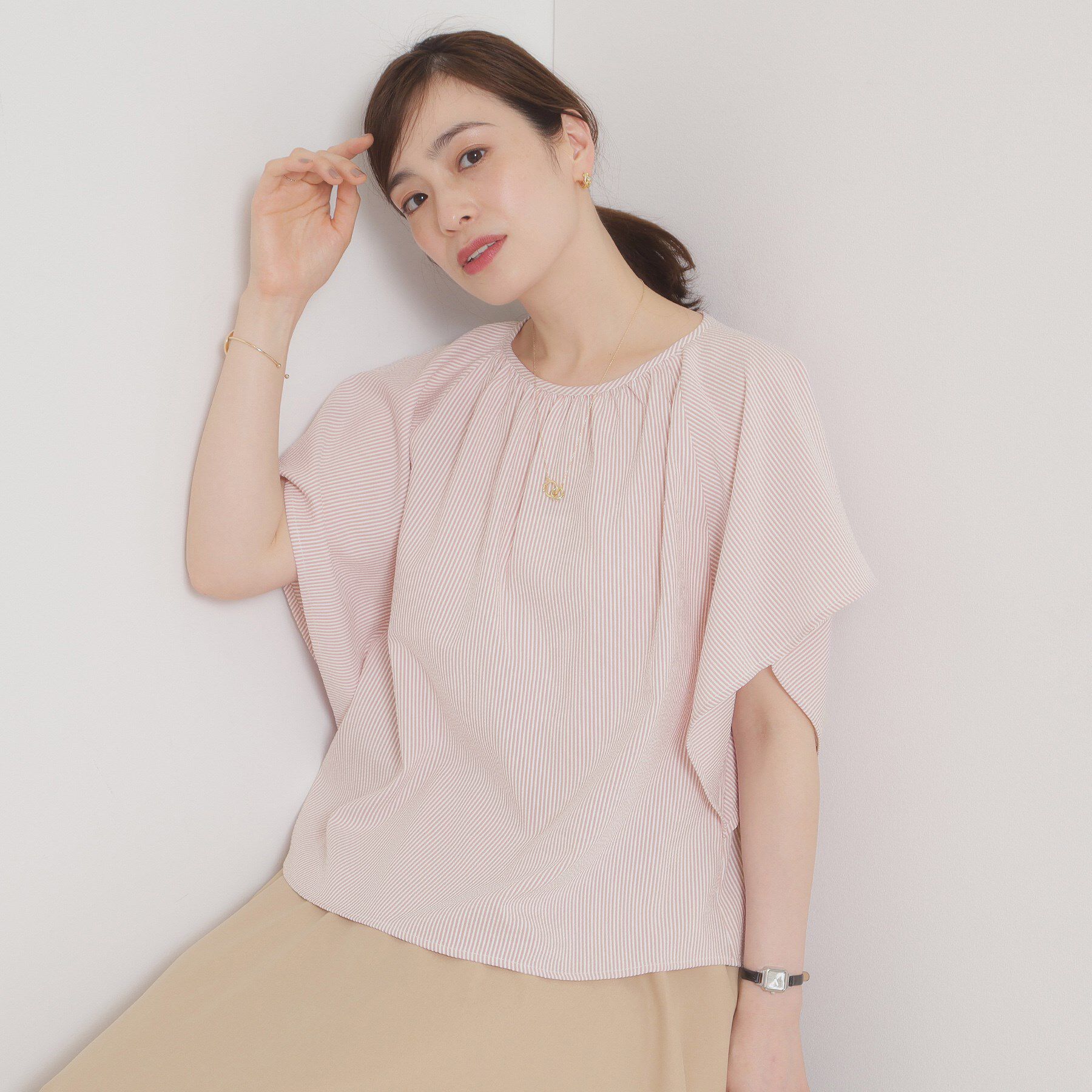 【デザイン】ビスチェ風のシャーリングデザインがトレンドライクな一着。クリーンなムードのストライプ柄が夏のコーディネートにピッタリのブラウス。トレンド.. |