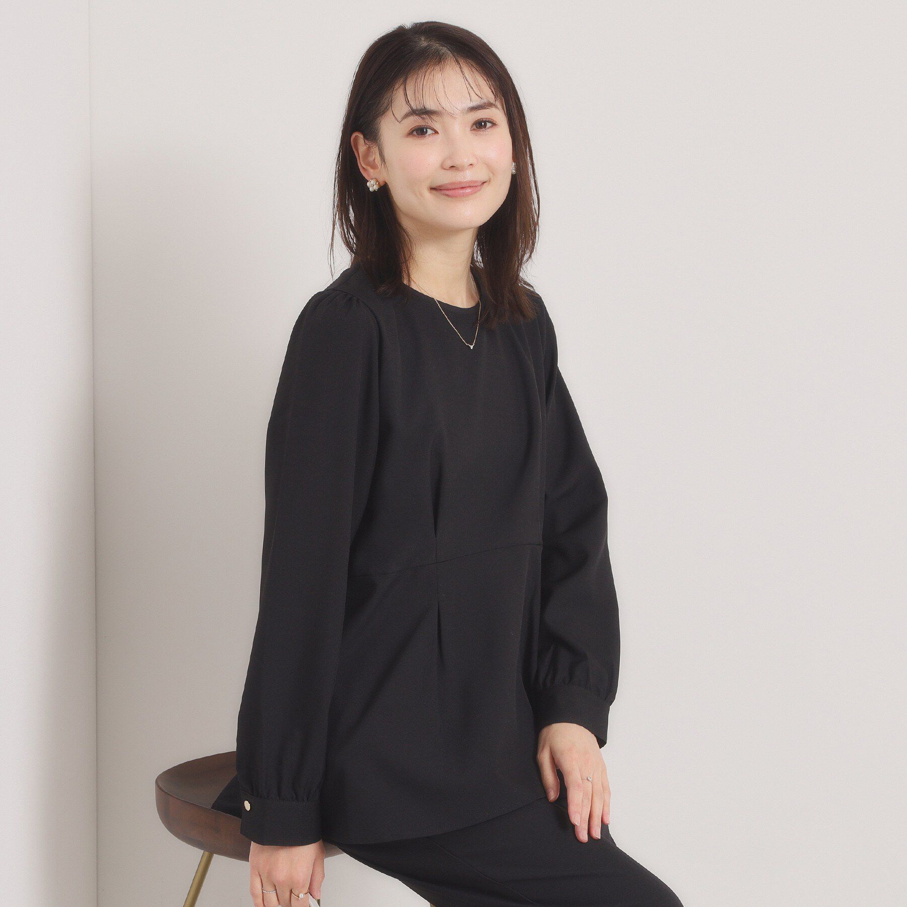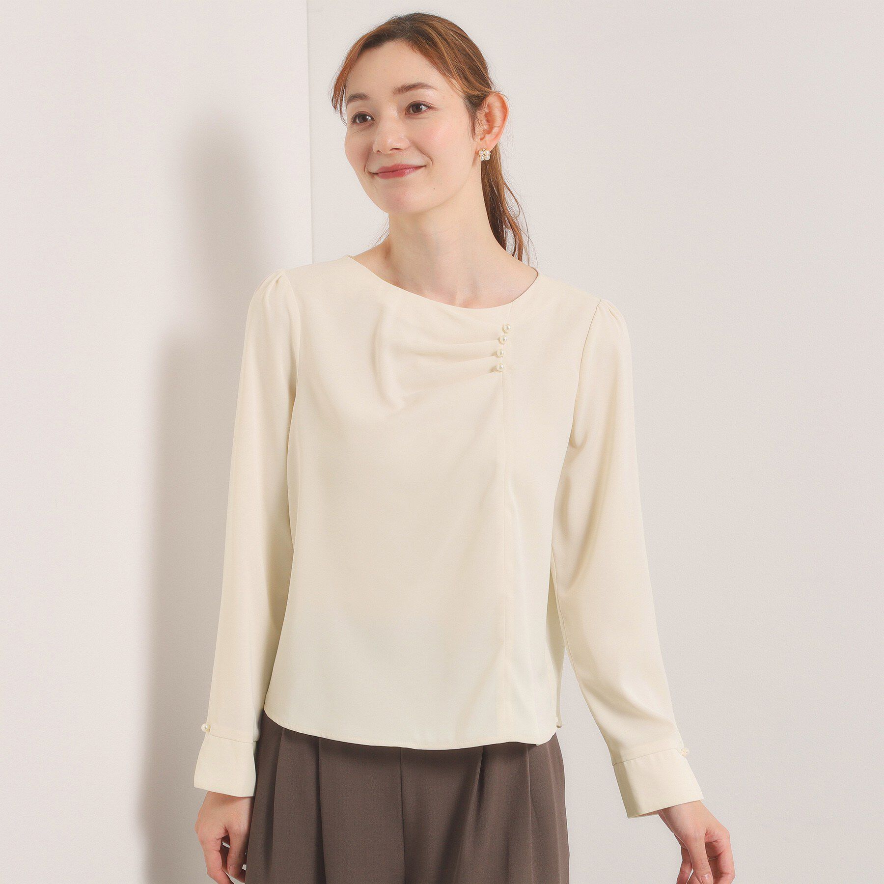 【デザイン】華やかさを演出してくれるドレープデザインにパール調飾り。ジャケットインに映えるブラウスです。つるんとしたフラットな表面感の素材を使用した.. |