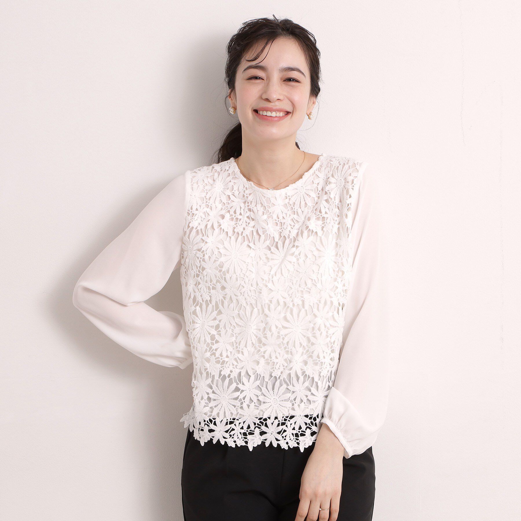 【デザイン】ジャケットINに映えるレースブラウス。ジョーゼット素材で軽やかな着心地。フロントに花柄レースをあしらった華やかなブラウス。存在感のある大き.. |