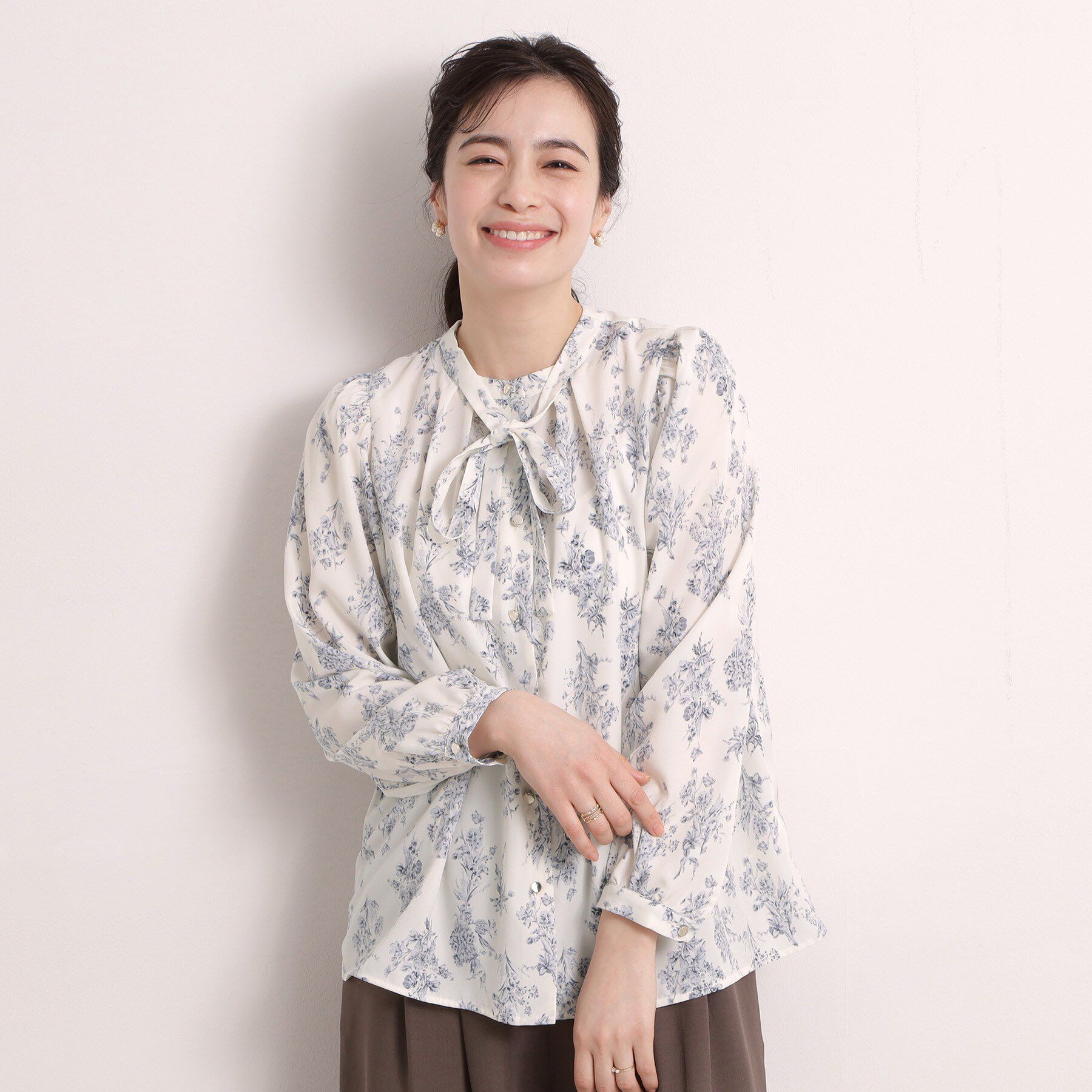 【デザイン】春ムード感じる花柄ブラウス。華奢なボウタイデザインが大人可愛い。甘すぎない大人な印象で着られる花柄ブラウス。ボウタイ幅を細めにすることで.. |