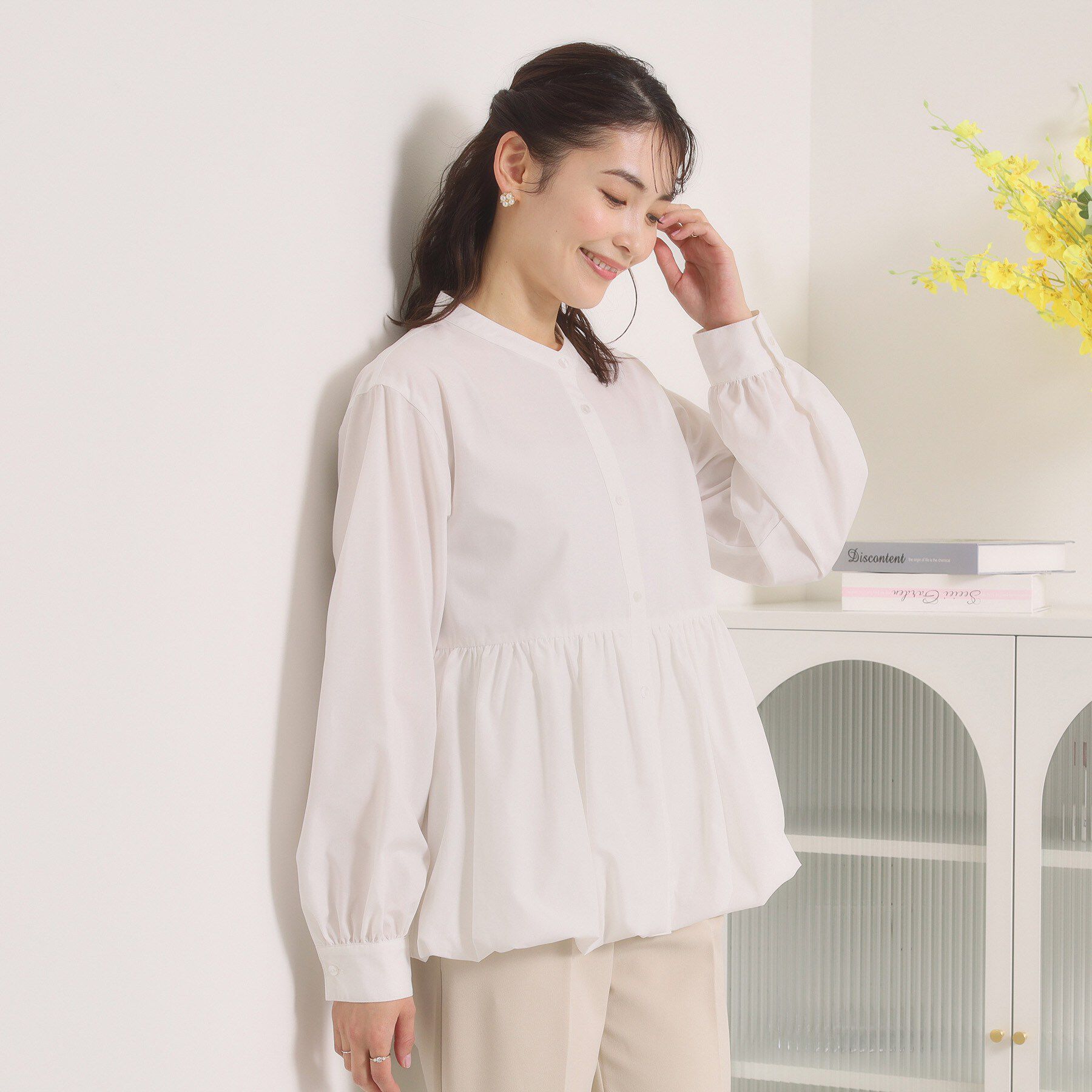 【デザイン】存在感あるバルーンフォルムが主役級。ほんのりモード感あるデザイン。コーディネートの主役になるバルーンフォルムのブラウス。適度なハリ感があ.. |
