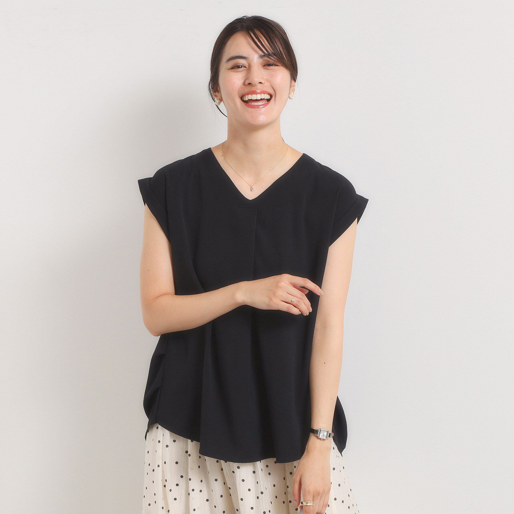 【デザイン】カジュアルからきれいめスタイルまで幅広く活躍。さらりと着られる前開きデザインのきちんと見えブラウス。ONからOFFまで幅広いシーンで活躍する.. |