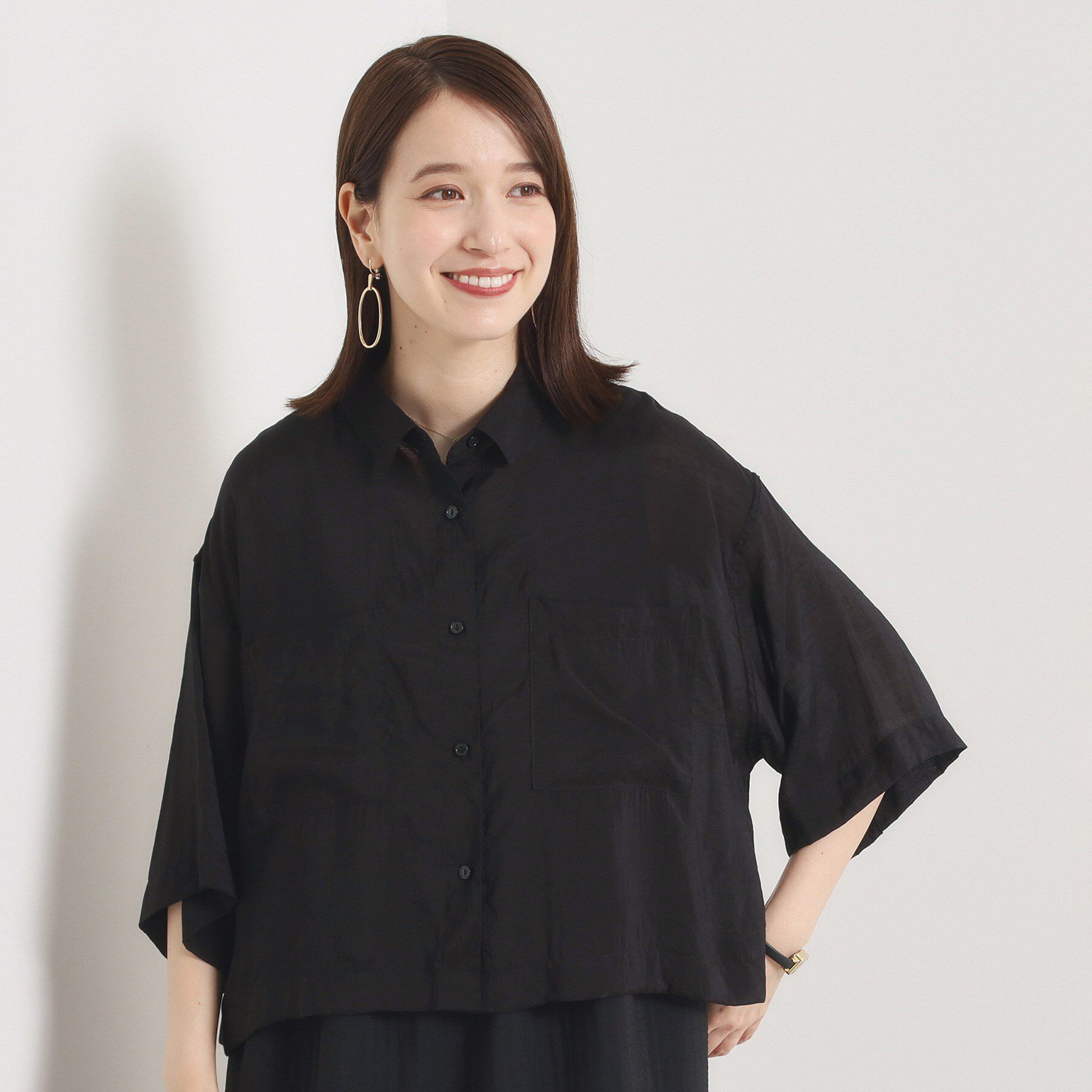 【デザイン】羽織としても一枚着としても優秀なシャツ。シアー感が今っぽさのある表情に。トレンドのシアー素材を使用したショート丈シャツ。程よいシアー感が.. |