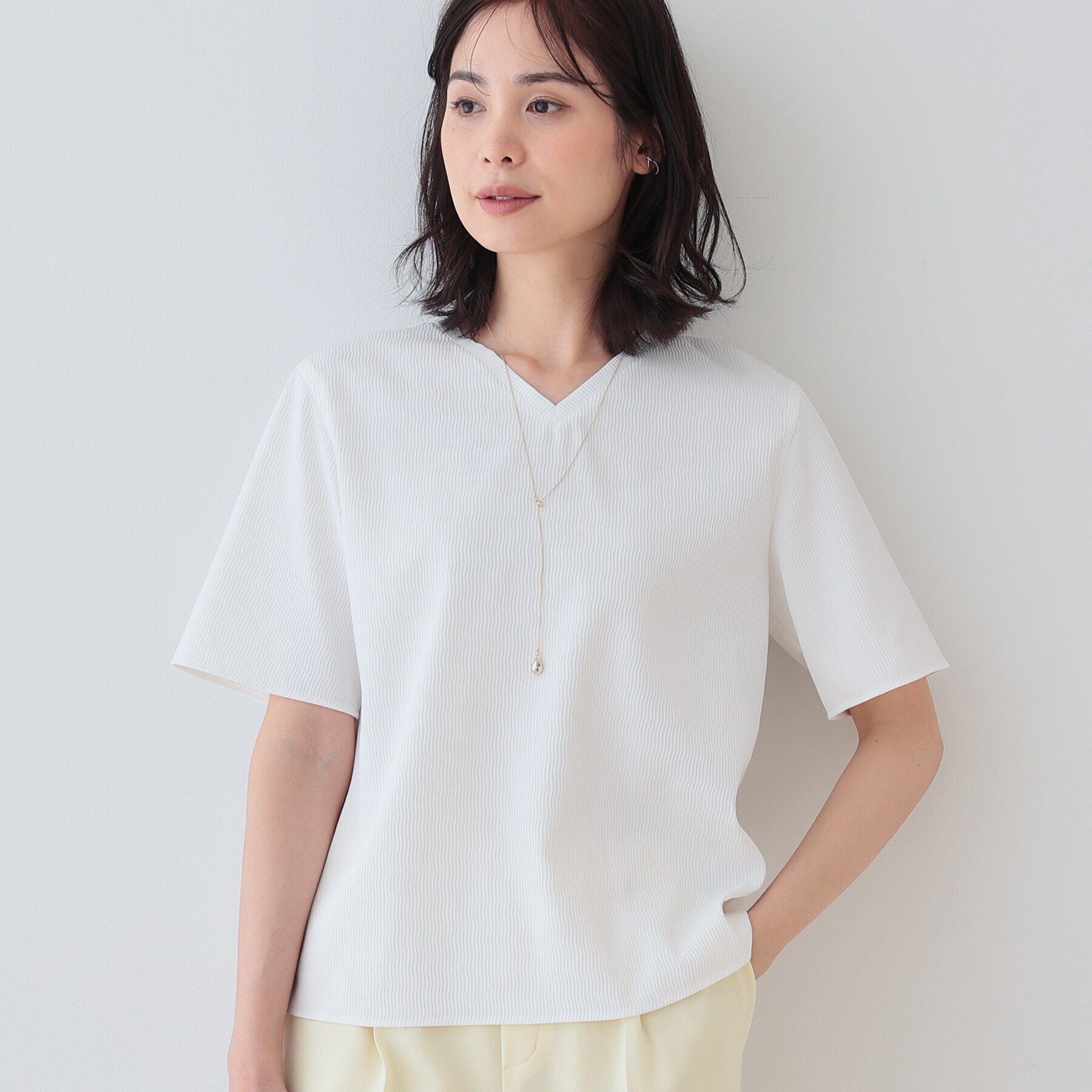 【デザインポイント】ウェーブ状の凹凸感が特徴のハリ感ある素材を使用したシンプルなTブラウスです。敢えてTシャツライクなデザインにすることでフレッシュな.. |