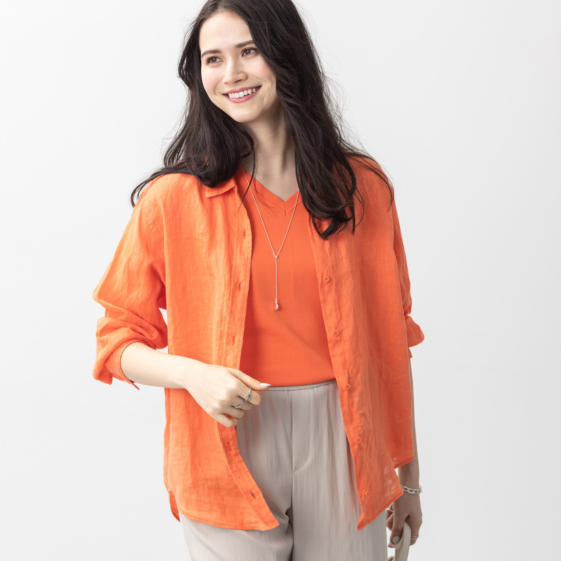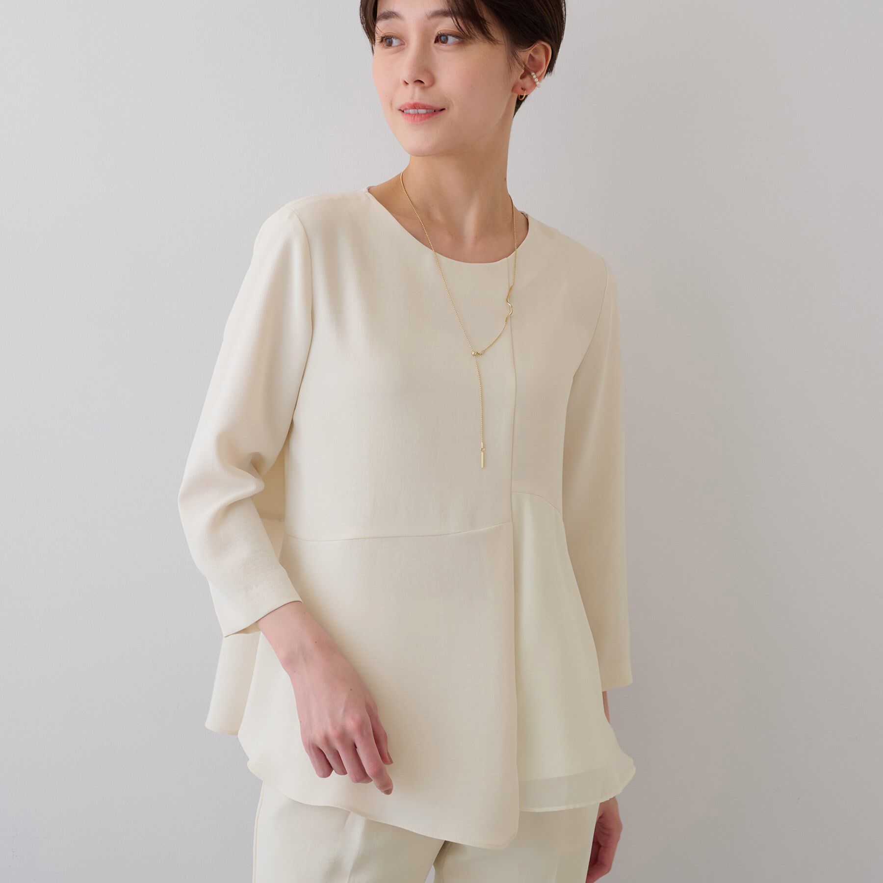 【デザインポイント】Vネックですっきりと仕上げたブラウス。全体的に少しゆとりを入れ、コンパクトすぎない、着やすいサイズ感にしています。【スタイリング.. |