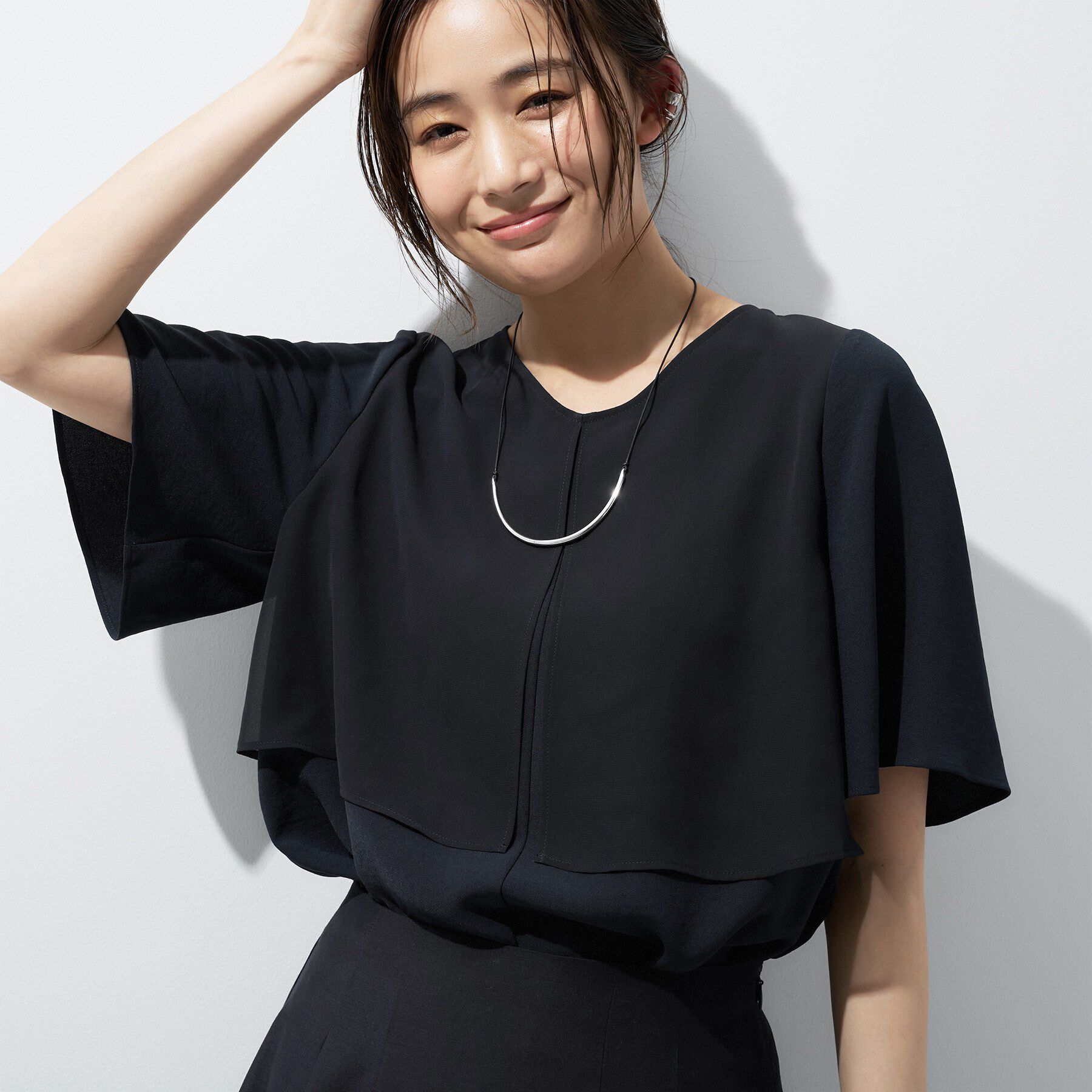【デザインポイント】素材の機能性を活かしたフォルム袖デザインブラウスです。どんなシーンにも着ていただけるように袖丈や着丈に拘り、パンツにもスカートイ.. |