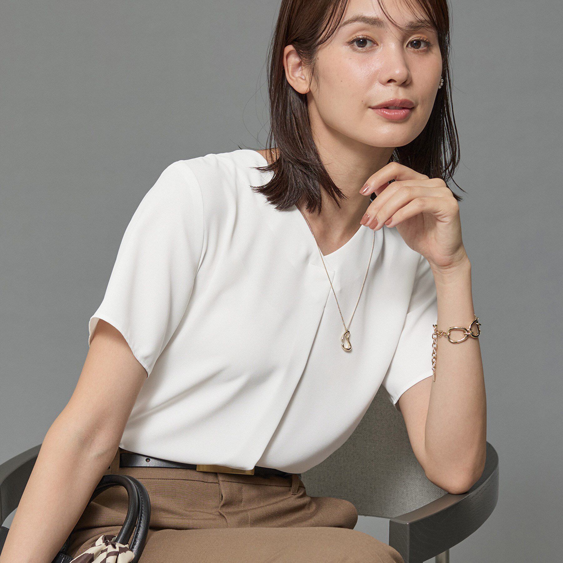 【デザインポイント】シンプルで程よい抜け感のあるVネックブラウスです。品の良さときちんと感を演出してくれます。ドレーピーな素材は女性らしさと軽やかさ.. |