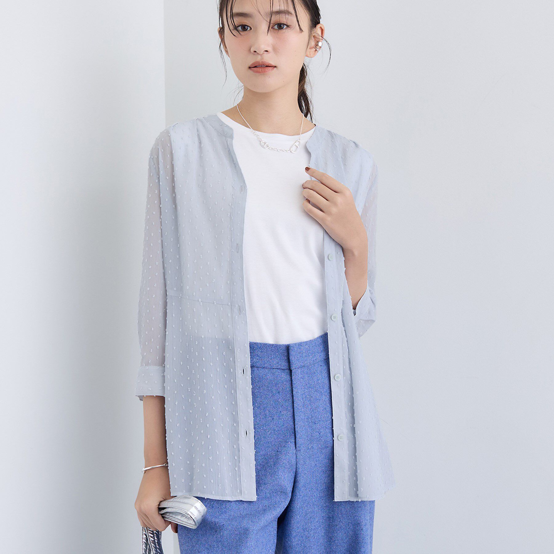 ドット柄のシアー素材を使用したウエスト切り替えブラウスです。前明きのスキッパーデザインなのでインナーを着て1枚着としても、前を開けて冷房対策の羽織り.. |