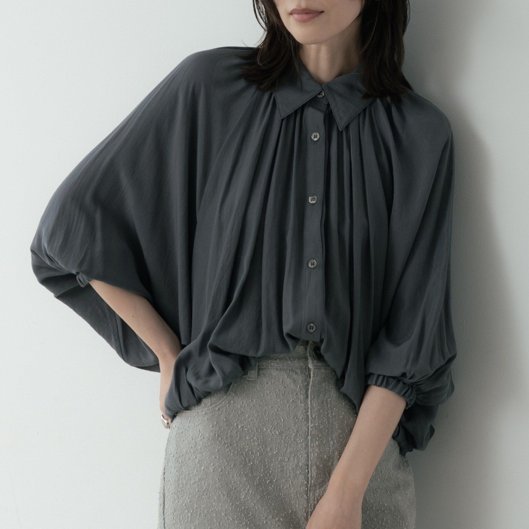 Design Pointボリューム感とドレープがモードなシルエットを生み出すフォルムブラウス。シャープで新鮮な衿デザインとラウンドした裾ギャザーが対比して、柔ら.. |
