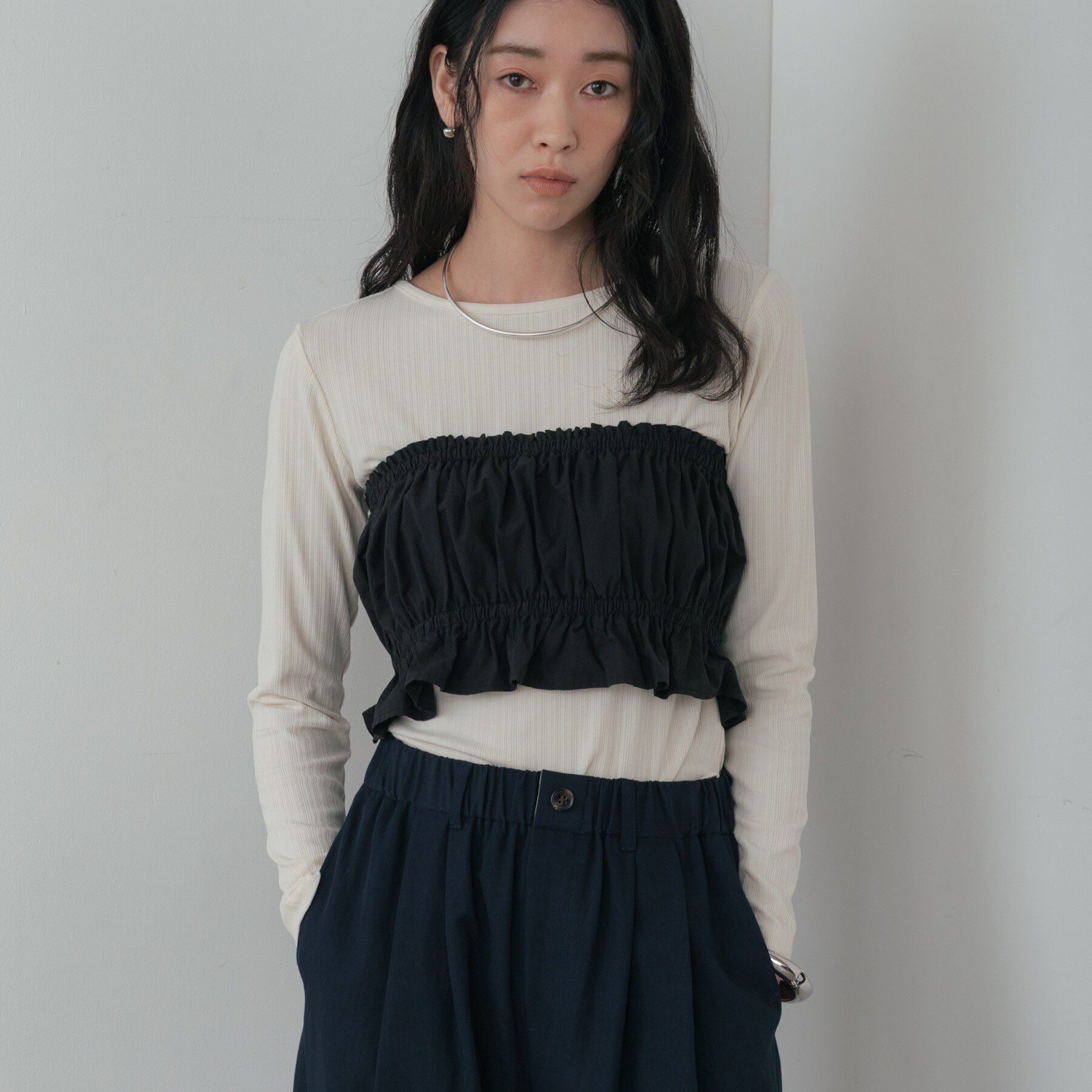 Design Point胸元のシャーリングと裾のフリルデザインが特徴のチューブトップ。シャーリングがバストラインを美しく見せつつ、フリルがモードな遊び心をプラス.. |