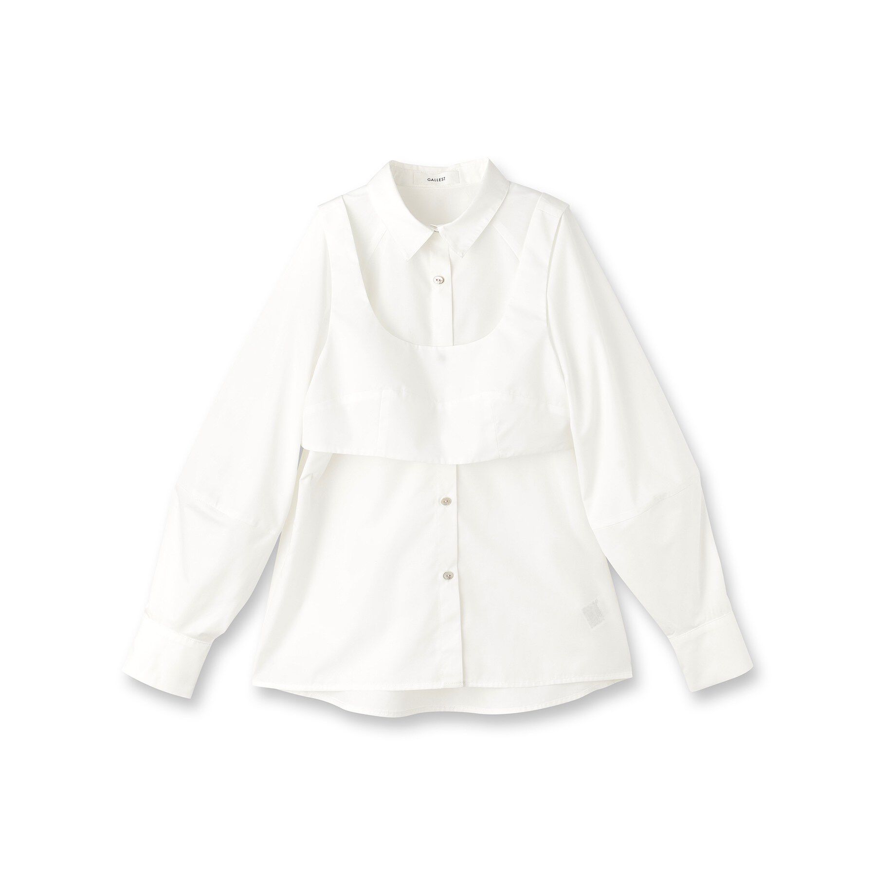 Design Pointビスチェをレイヤードしたデザインが、一枚で旬のスタイルを叶えるシャツブラウス。ラグランスリーブの袖フォルムがモードな印象を与え、スタイリ.. |
