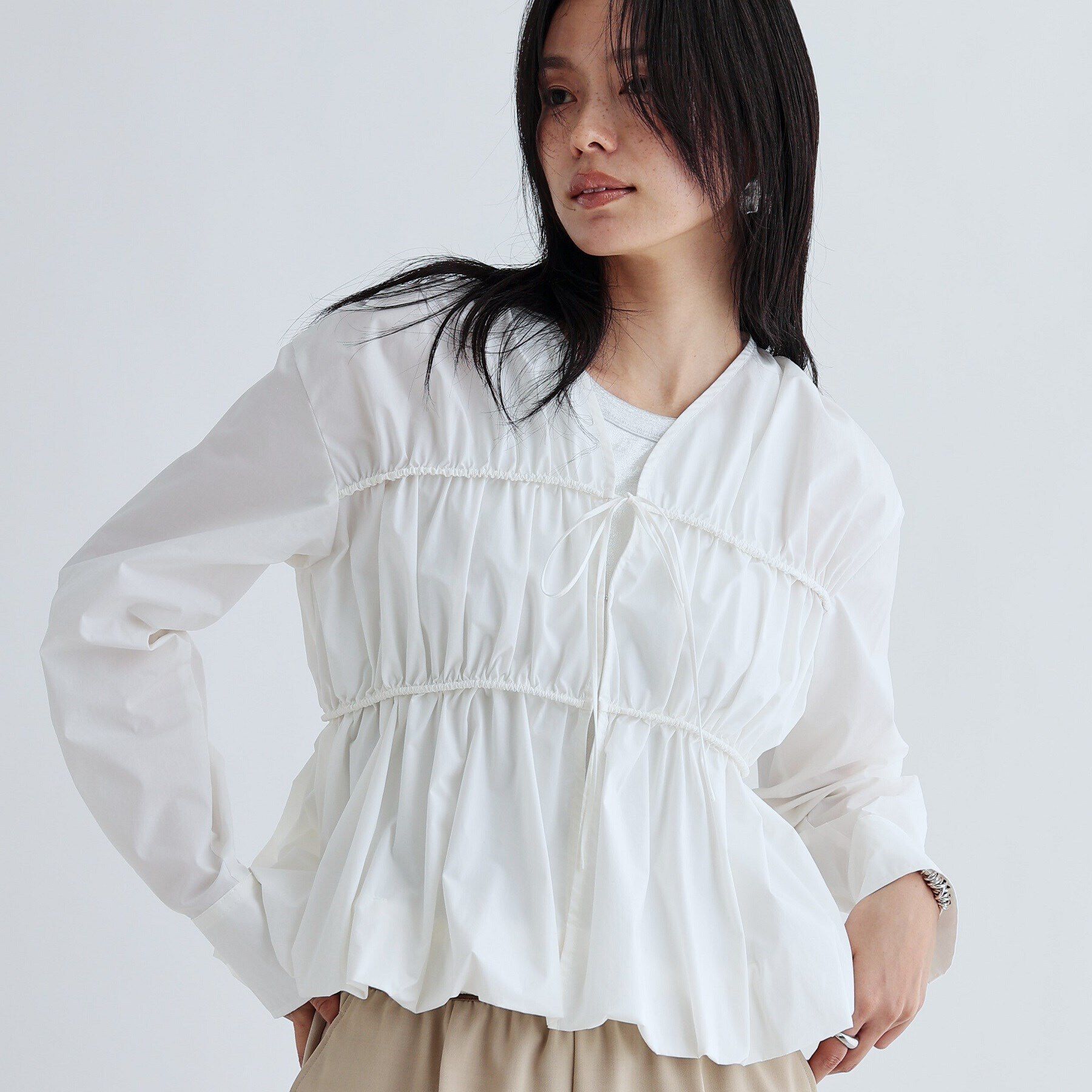 Design Point大胆なボリュームが存在感を出してくれるシャツ。タックディテールで立体感とエアリー感を出したバルーンシルエットにしています。前後差のついた.. |