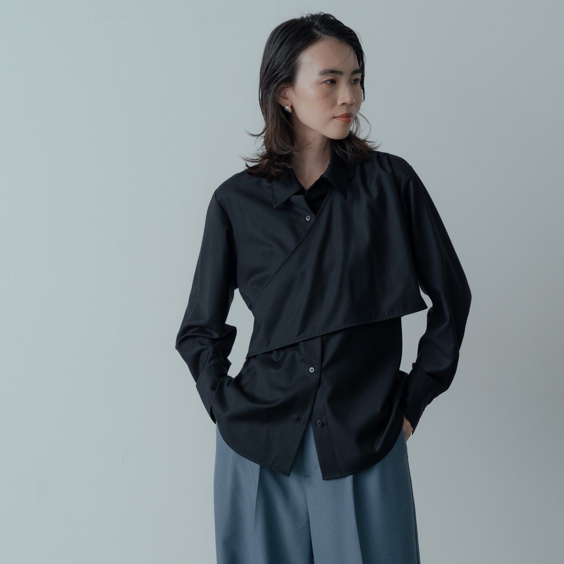 Design Pointアシンメトリーなクロスデザインで、一枚でジレを重ねたような着こなしができるシャツ。独特のデザインとシルエットが目を惹くアイテムです。Styl.. |