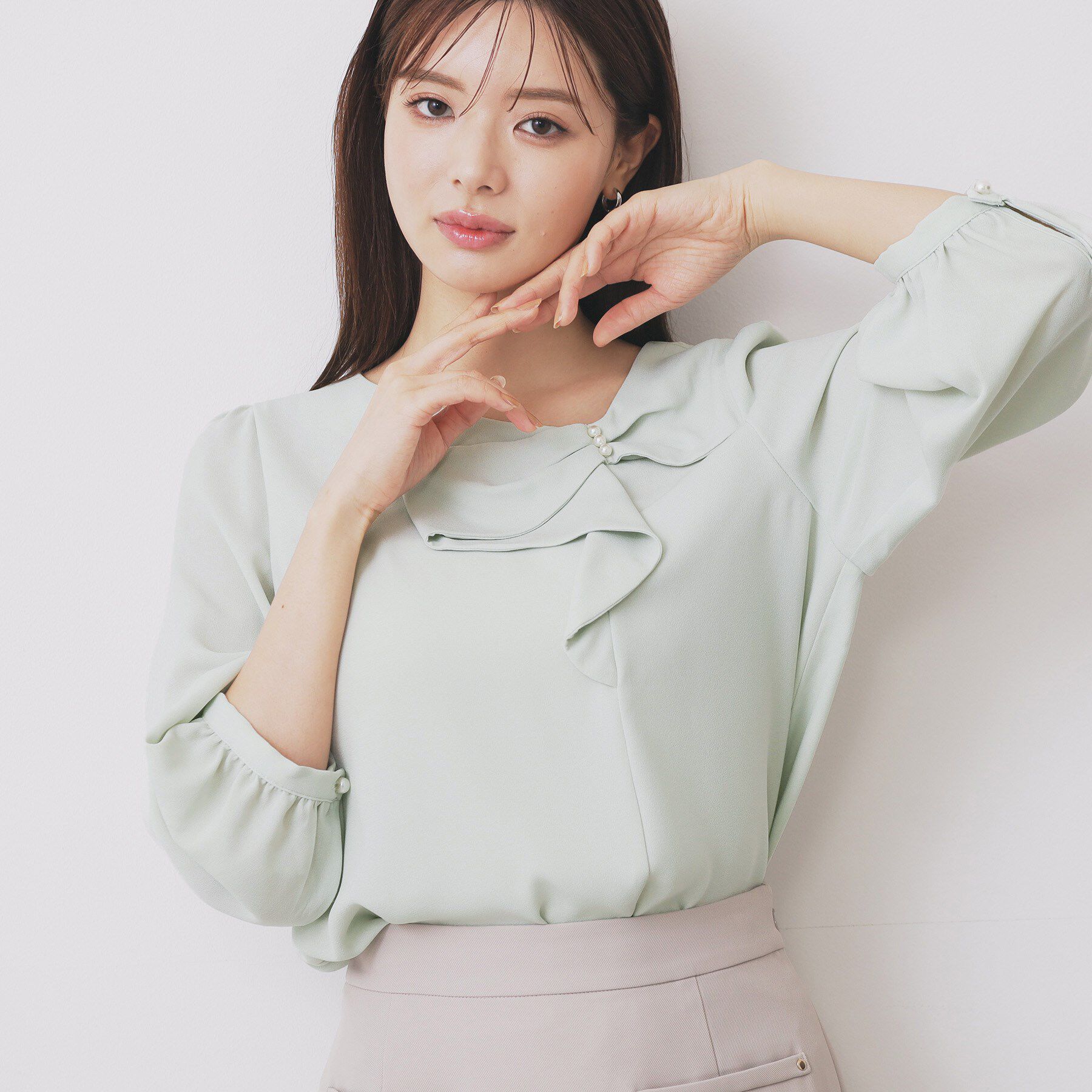 パール調が施されたリボン風フリルが華やかなブラウス【デザイン】・エレガントなパール調があしらわれたリボン風のフリルがアクセントの、洗練されたブラウス.. |