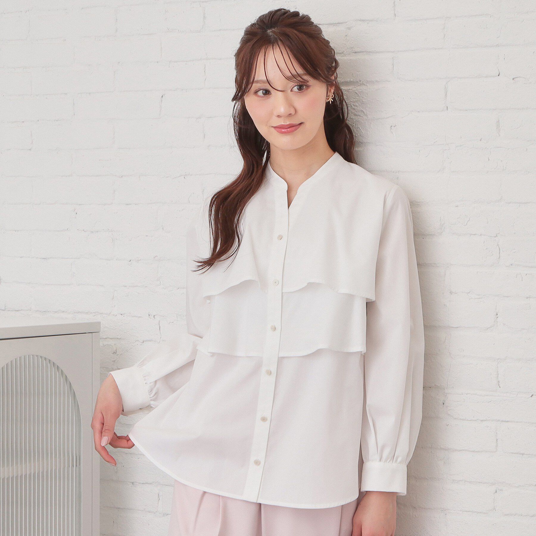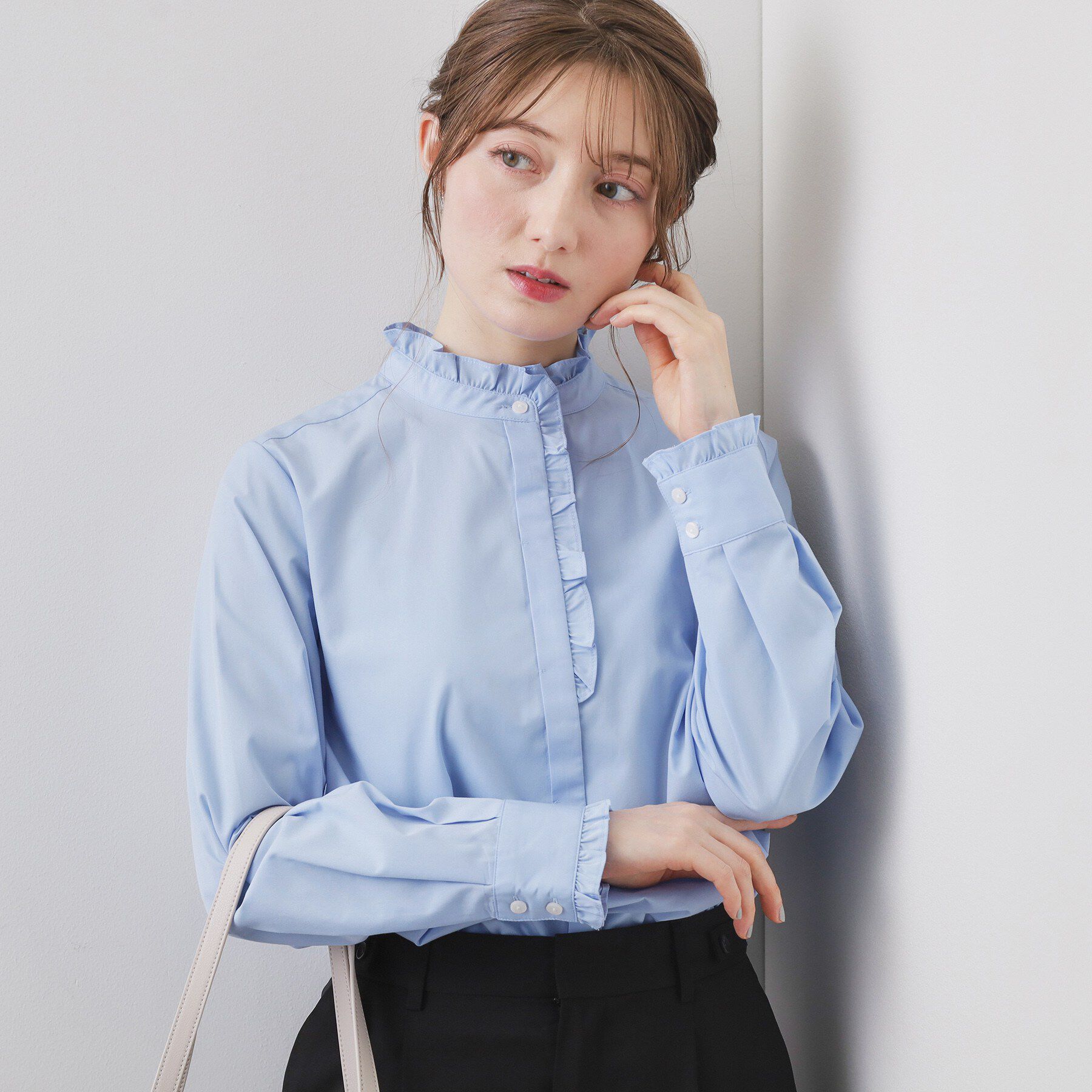 キレイめコーデに着まわしやすいアイテムバンドカラーフリルブラウス【デザイン】・バンドカラー×フリルデザインの絶妙な組み合わせで、清潔感と華やかさを両.. |