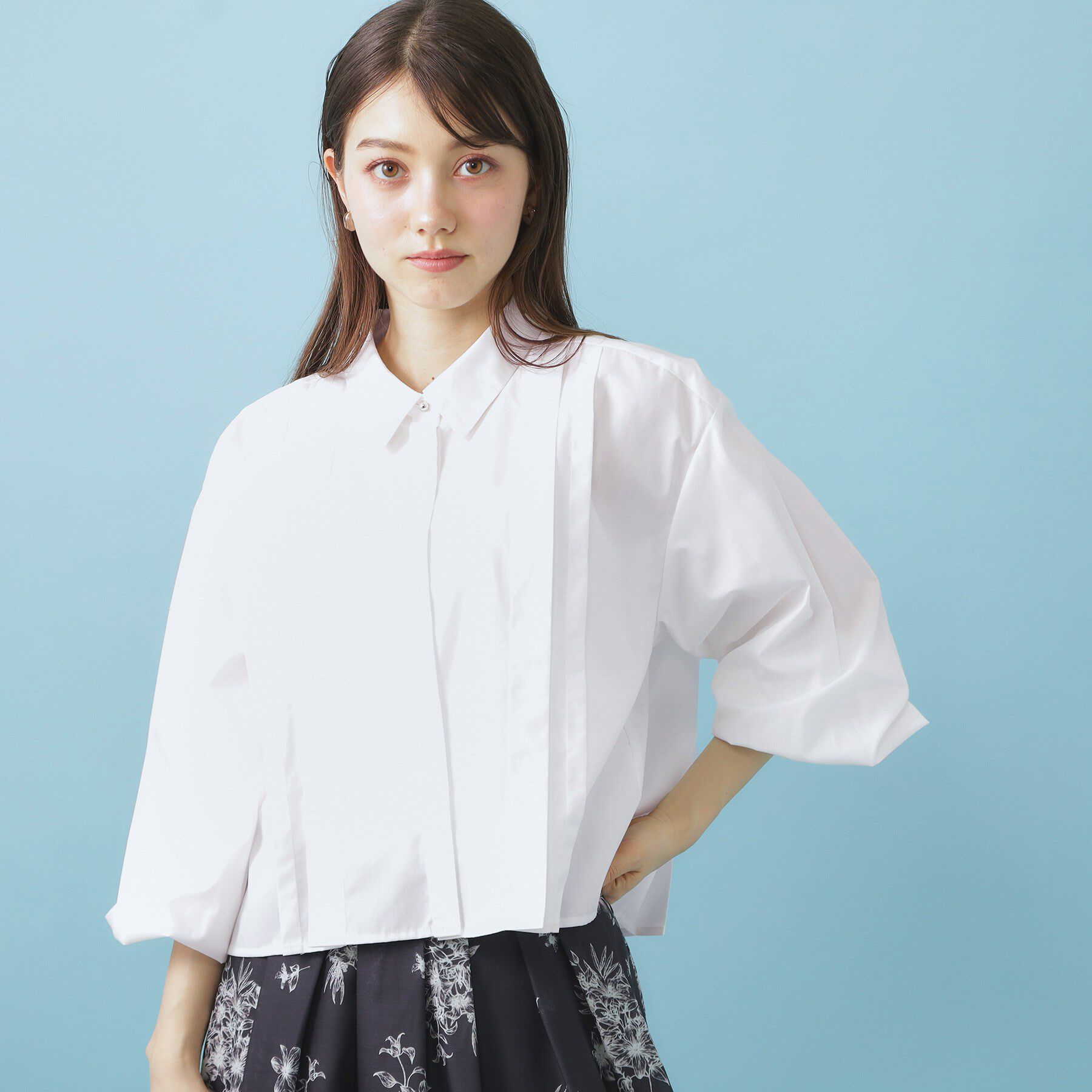 環境に配慮したエシカルブロードの短丈タックシャツ【デザイン】・洗練された短丈デザインが、腰回りをすっきり見せ、スタイルアップ効果を実現。・フロント部.. |