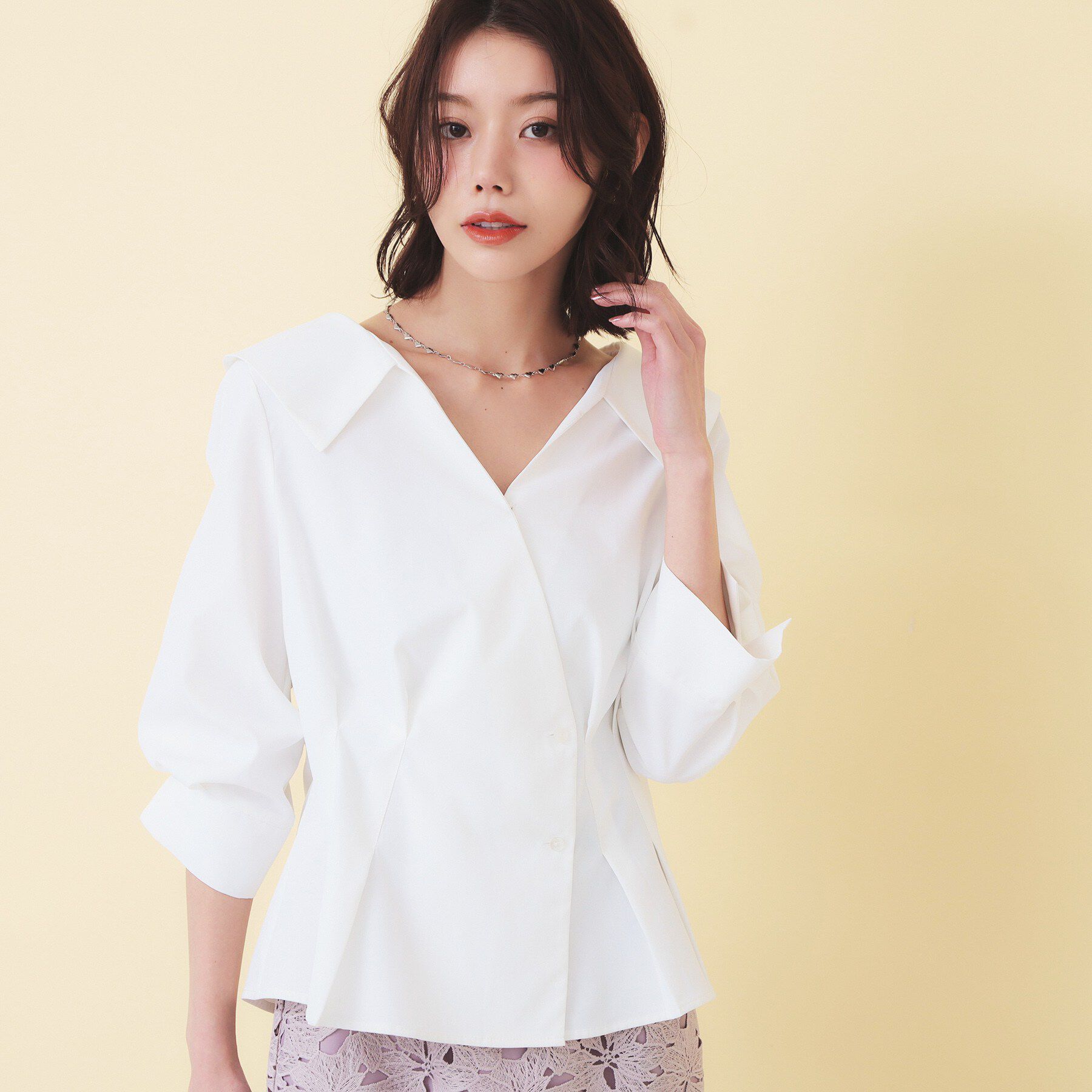 立体感が魅力的なアシンメトリーレイヤードボウタイブラウス【デザイン】・フロントのアシンメトリーな2段レイヤードが、動きのある立体感を生み出し、視線を.. |