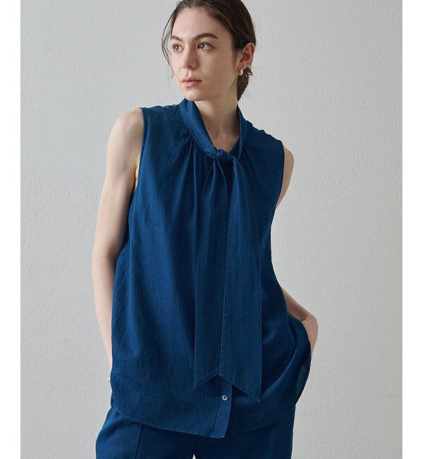 【2026SS】 暑いシーズンも快適に楽しめる、ライトなデニムブラウス ■ライトオンスのデニム生地で仕立てたノースリーブのボウタイブラウス。 ■ライトブルー.. |