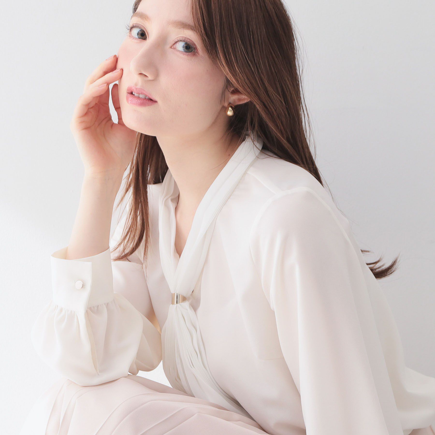 プリーツボウタイとゴールドパーツが華やぎを添える、機能性も高いジョーゼットブラウス【デザイン】・フロントのプリーツボウタイがエレガントさを演出し、 .. |