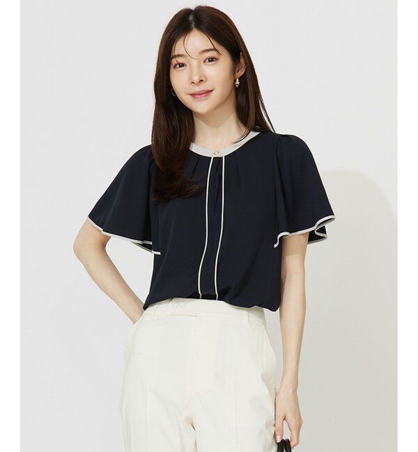 汗ばむ季節でも一枚できちんと見え!バイカラーが映えるきれいめブラウス■デザイン・フレア袖とバイカラーデザインが着映えるブラウス・フロントのフェイクパ.. |