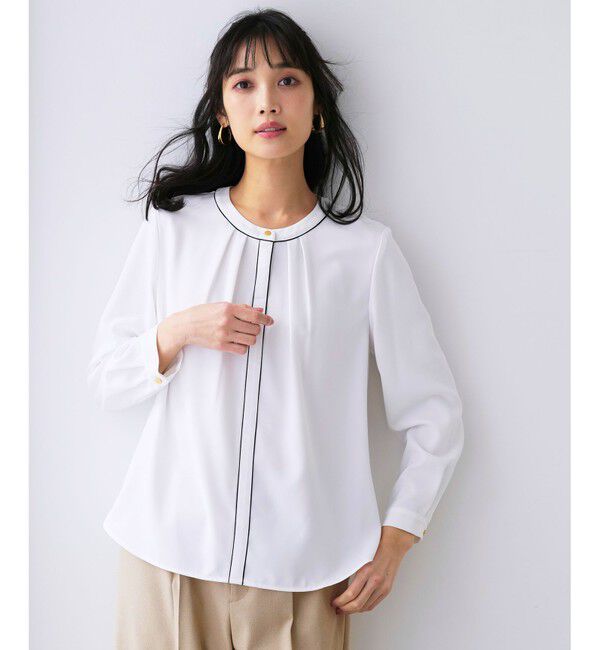バイカラーデザインが映えるトロミ素材の上品ブラウス■デザイン・細幅のバイカラーデザインがアクセント・ジャケットインにも映える一枚・前立て風デザインで.. |