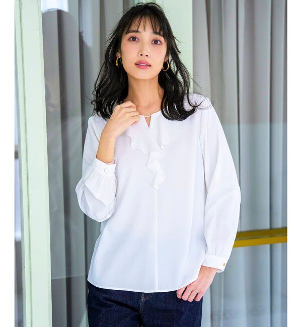 フリルで華やぐきれいめブラウス■デザイン・一枚で着映えるフリルデザインがポイントのブラウス・普段着や通勤着などオンオフ活躍・フロント部分のバーパーツ.. |