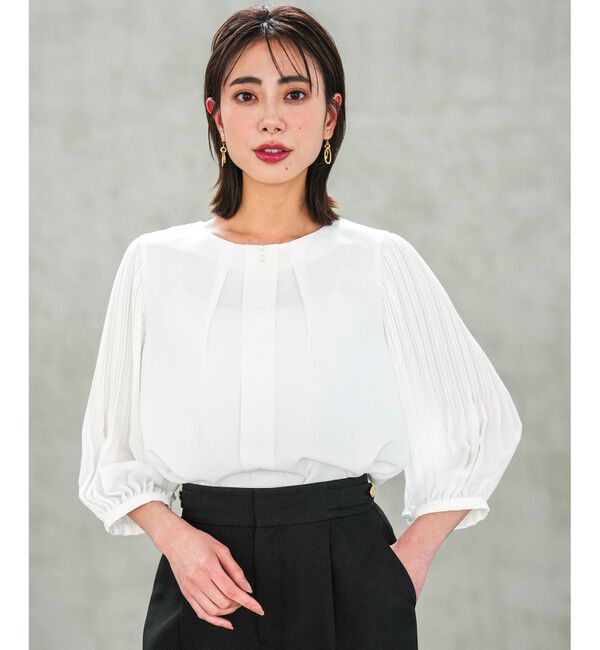 袖プリーツが華やかなアクセント。一枚で着映えるエレガントブラウス■デザイン・袖のシフォン素材にランダムプリーツ加工施すことでデザイン感をプラス・前立.. |