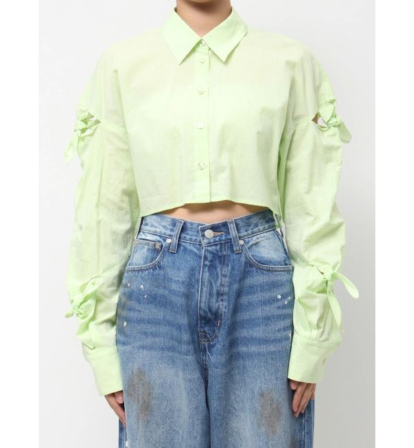 袖のカットアウトリボンがポイントのショートシャツ■デザインハイウエストボトムとの相性がいい着丈のバランスになります。前を閉めてトップスでも、開けて羽.. |