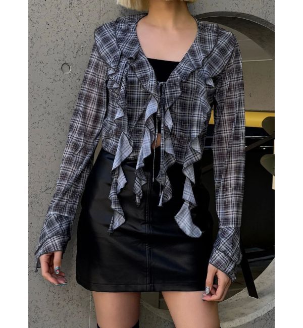 トレンドのラッフルフリルディテールがポイント!■デザインフロントはリボン紐で羽織の着用も出来るデザインです。伸縮性のあるカット生地は着心地も良く、程.. |
