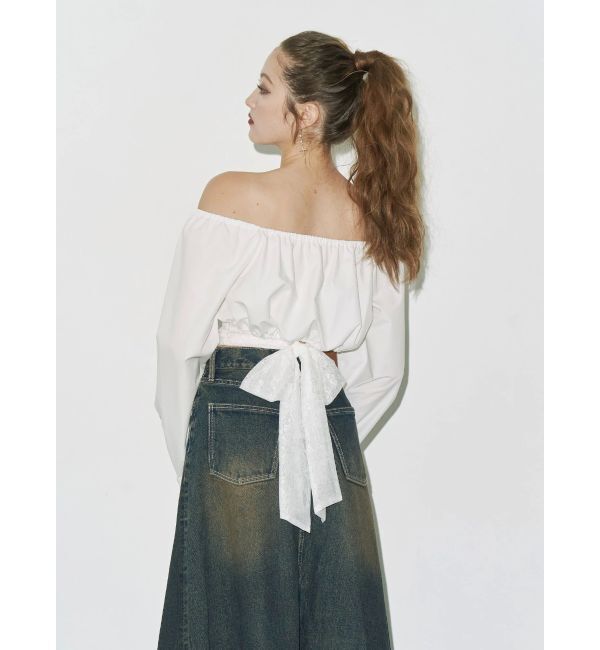 レースのバックリボンがポイントのオフショルブラウス。オフショル部分はゴムになっているので、肩まで上げて着ることもできます。オーバーサイズのスリーブが.. |