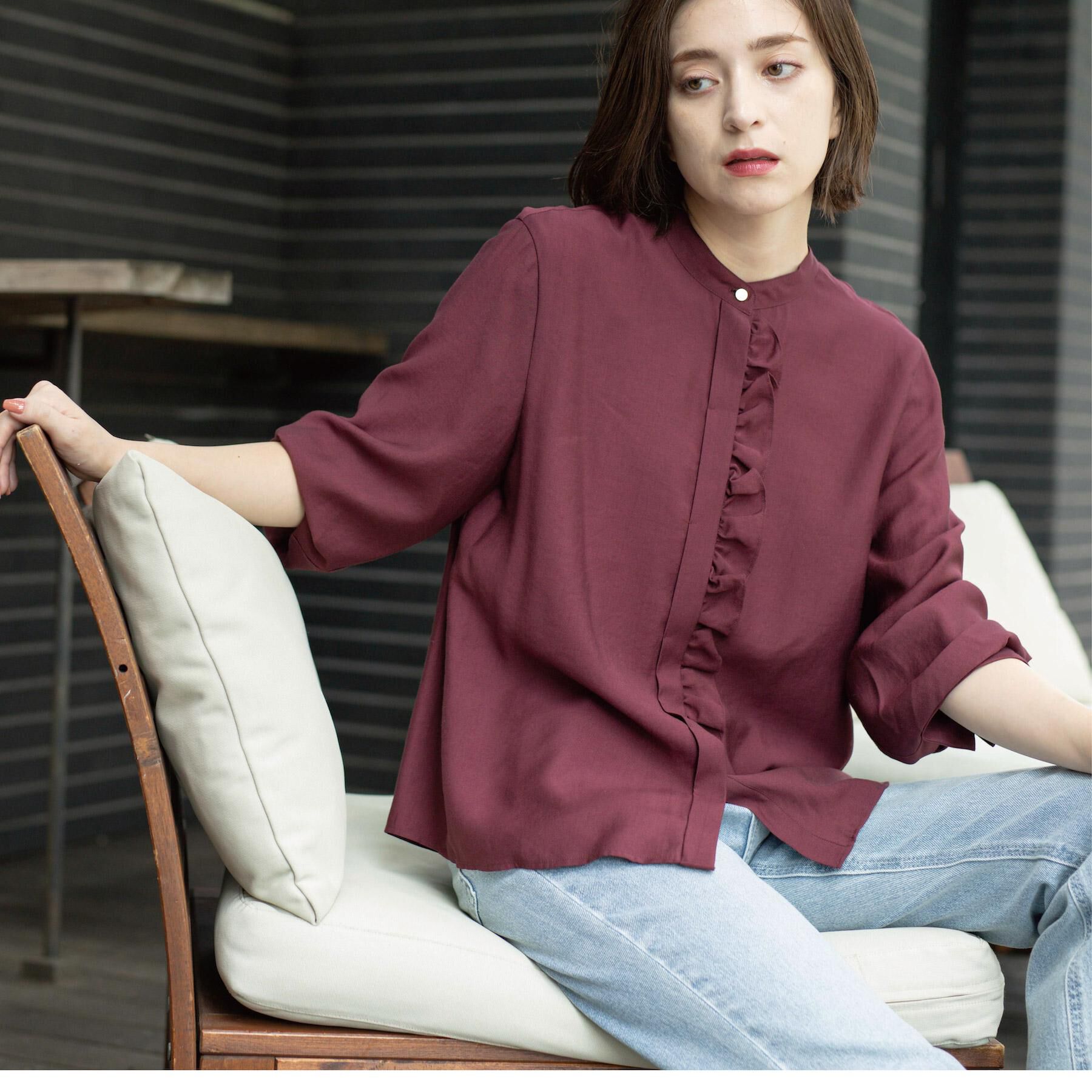 人気の前あきフリルデザインブラウスウール混の上品な風合いが素敵な一枚【デザイン】・通勤にもオススメな前開きのきれいめデザインブラウス。・前立てに施し.. |