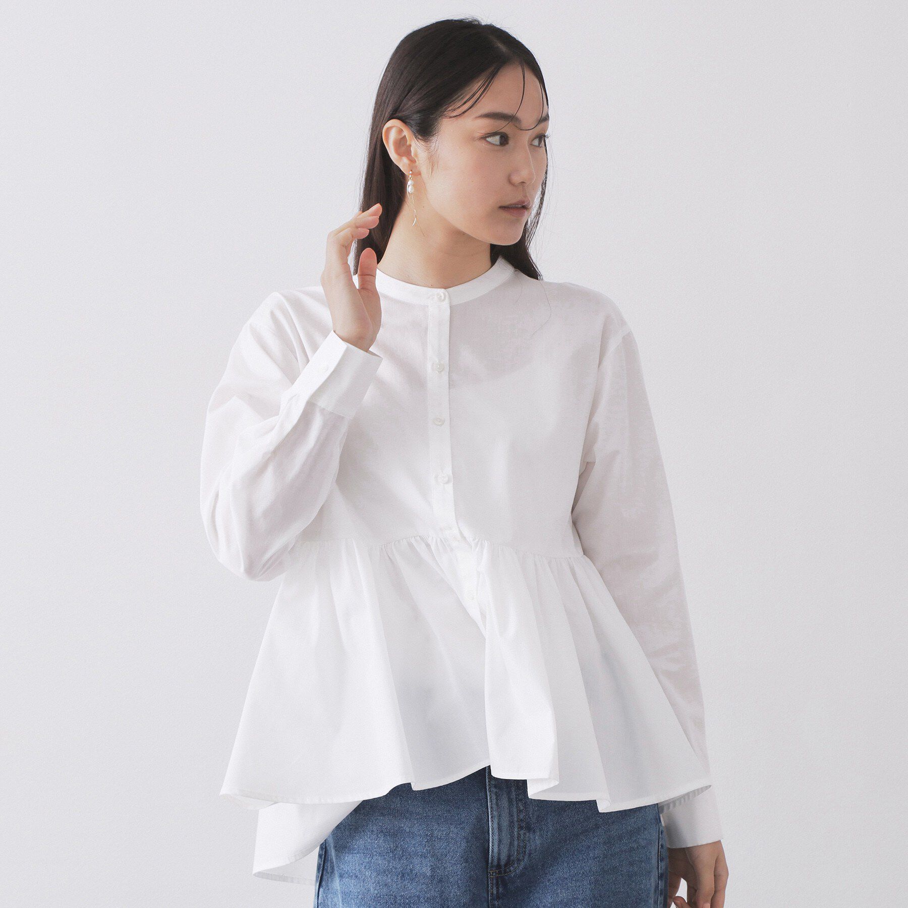 トレンドのレイヤードスタイルにも活躍するペプラムシャツ【デザイン】・バンドカラーに少し前後差のあるペプラムシルエットがポイントのシャツブラウスです。.. |
