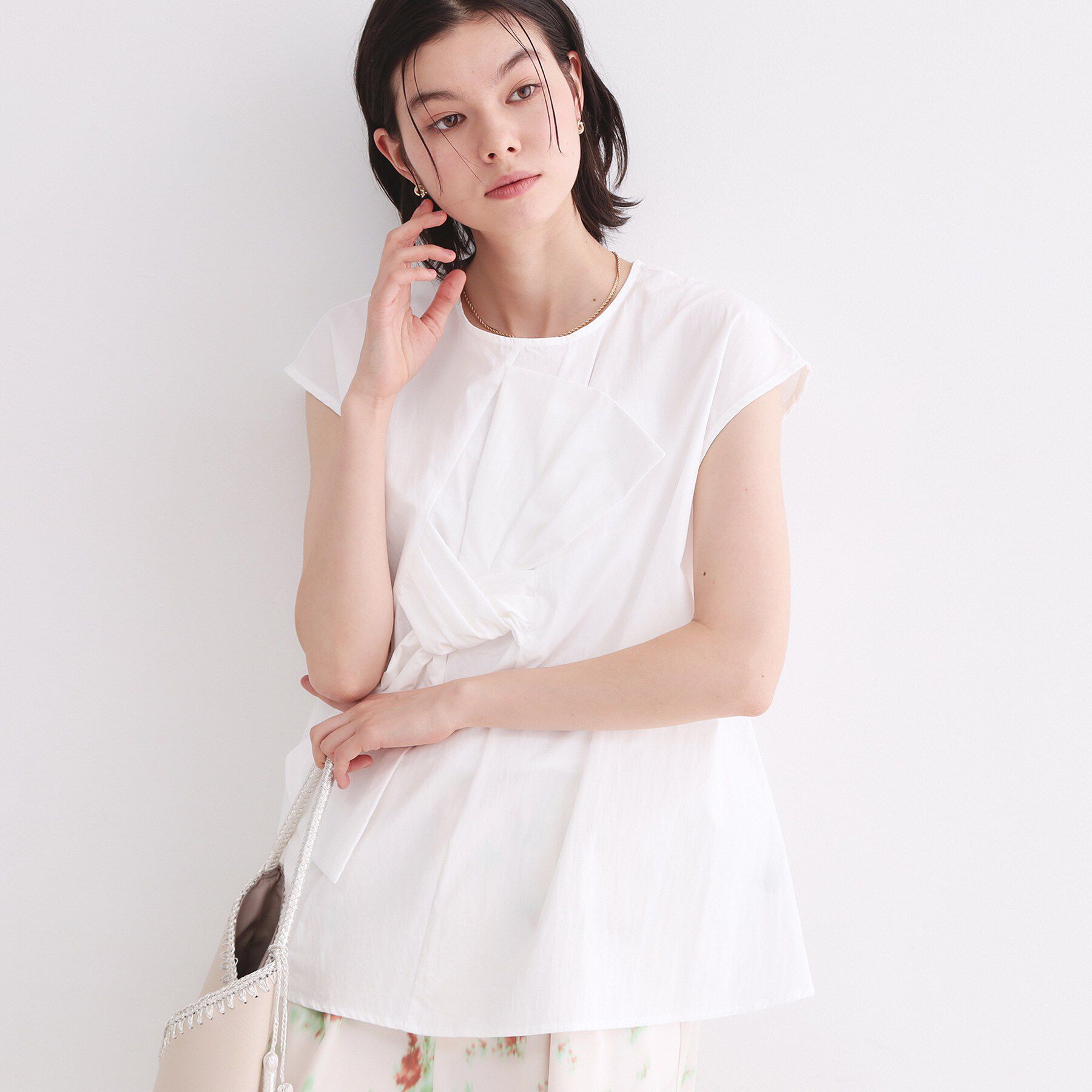 リボンデザインがモードなフレンチスリーブブラウス【デザイン】・フロントに大胆にあしらった、縦リボンデザインが華やかなブラウス。・リボンモチーフながら.. |
