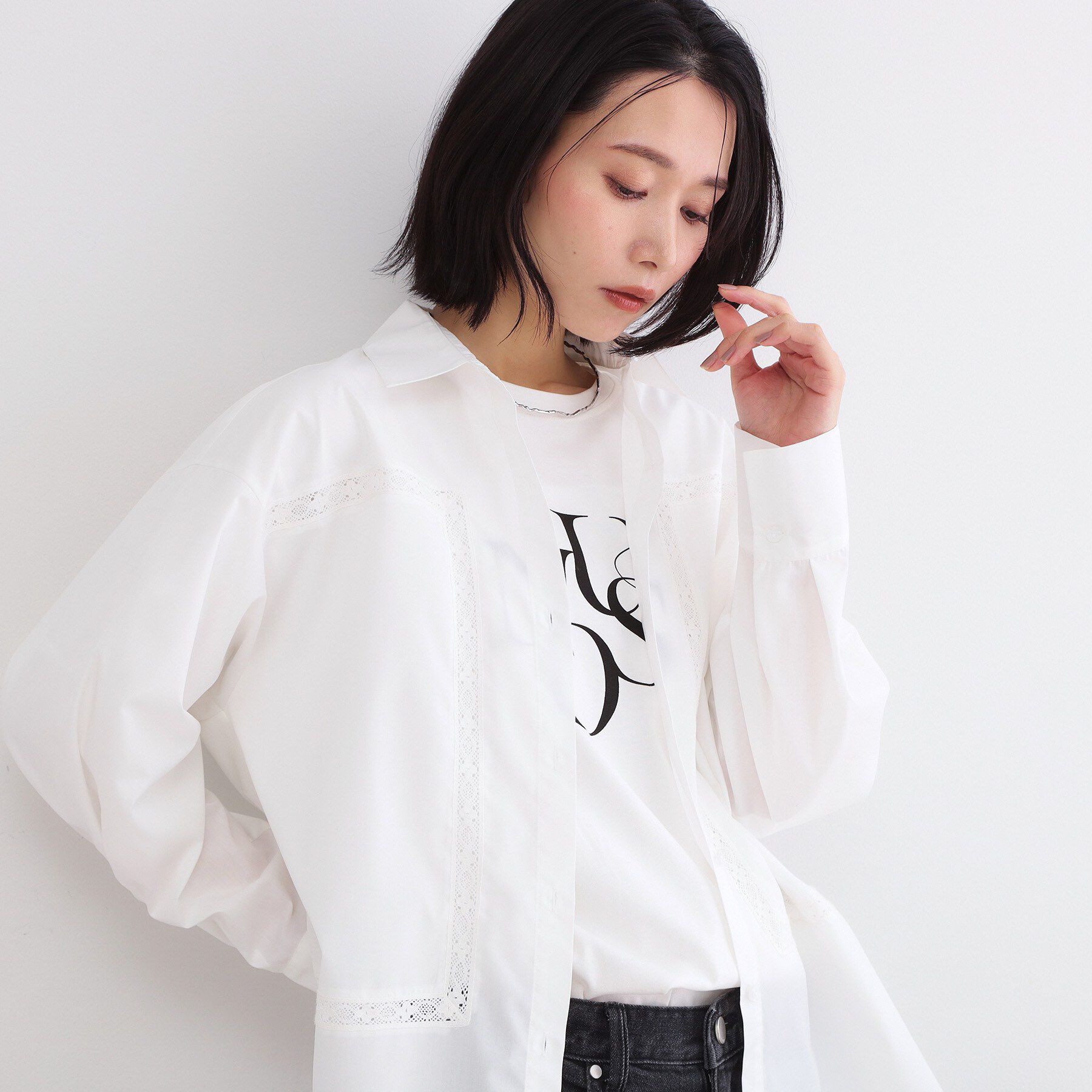 レースのトリミングがポイント!羽織りにもおすすめのデザインシャツ【デザイン】・一枚着としても、羽織りとしても、レイヤード用にも活躍する、着回し力◎の.. |