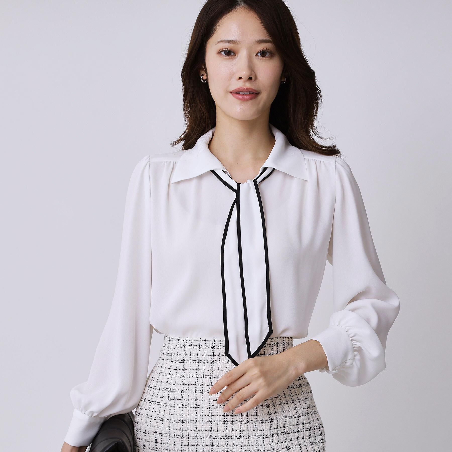 〇デザインポイントウイングカラーが新鮮なエレガントなブラウス。配色パイピングのボウタイ付きで、結び方や取外しなどアレンジしていただけます。袖口カフス.. |