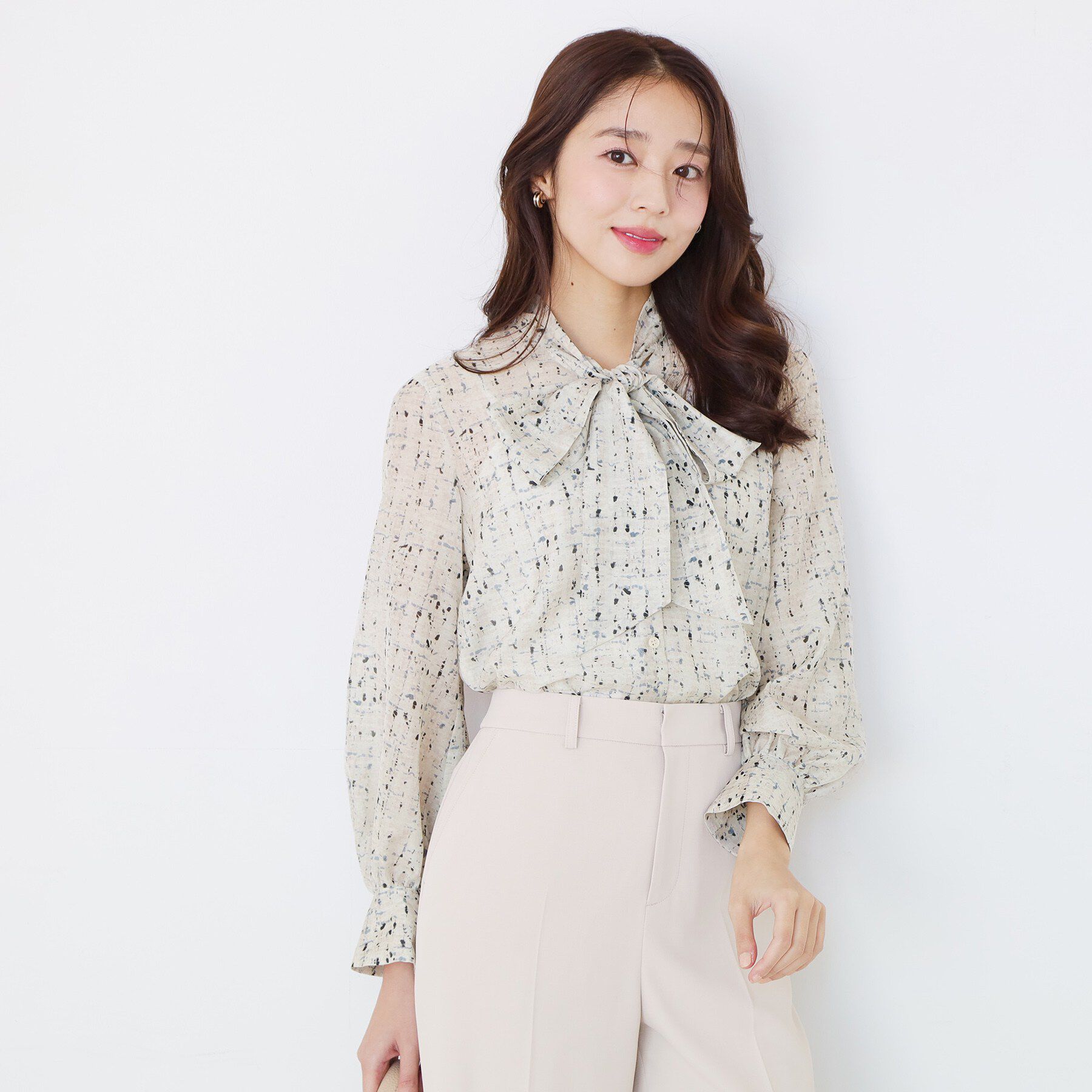 【デザインポイント】カラフルなプリントが印象的なローン素材のブラウス。華やかで女性らしいボウデザインです。袖口はカフス仕様で程よいバルーン袖にしてい.. |