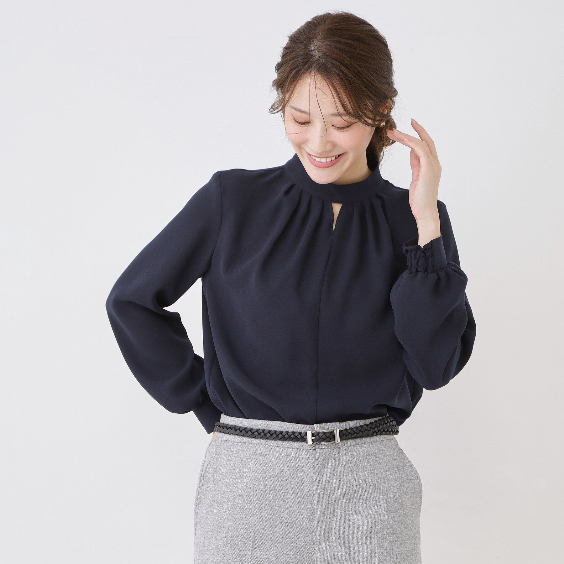 〇デザインポイントドレープ性の高いジョーゼットで仕上げたブラウスです。ほんのり肌見せの衿元のキーネックがアクセントになります。また衿刳りのタックがよ.. |