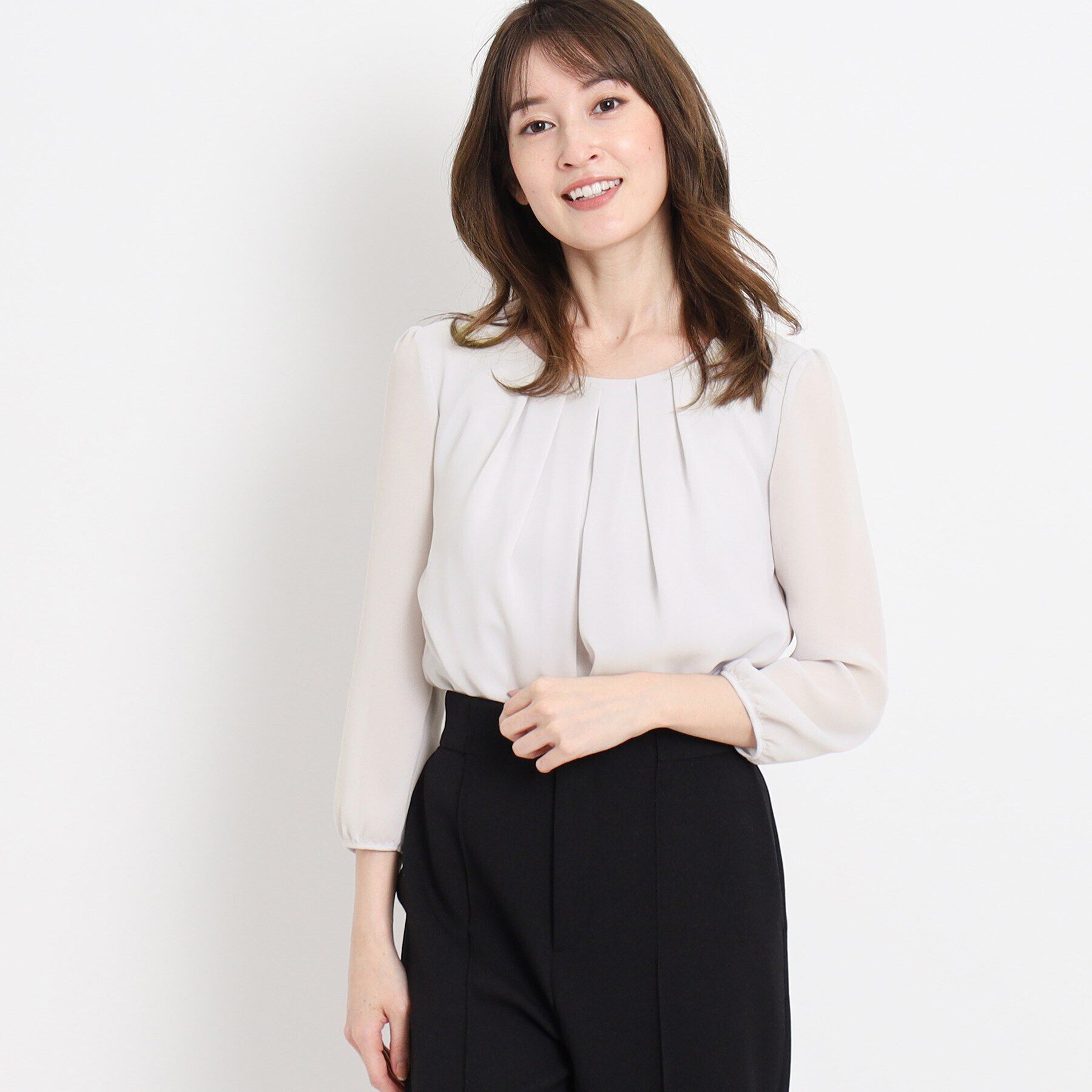 〇デザインポイントカシュクール風デザインのブラウス。デコルテがきれいに見えるラウンドネックです。前裾は裏地で吊り上げた自然なブラウジングが特徴で、ス.. |