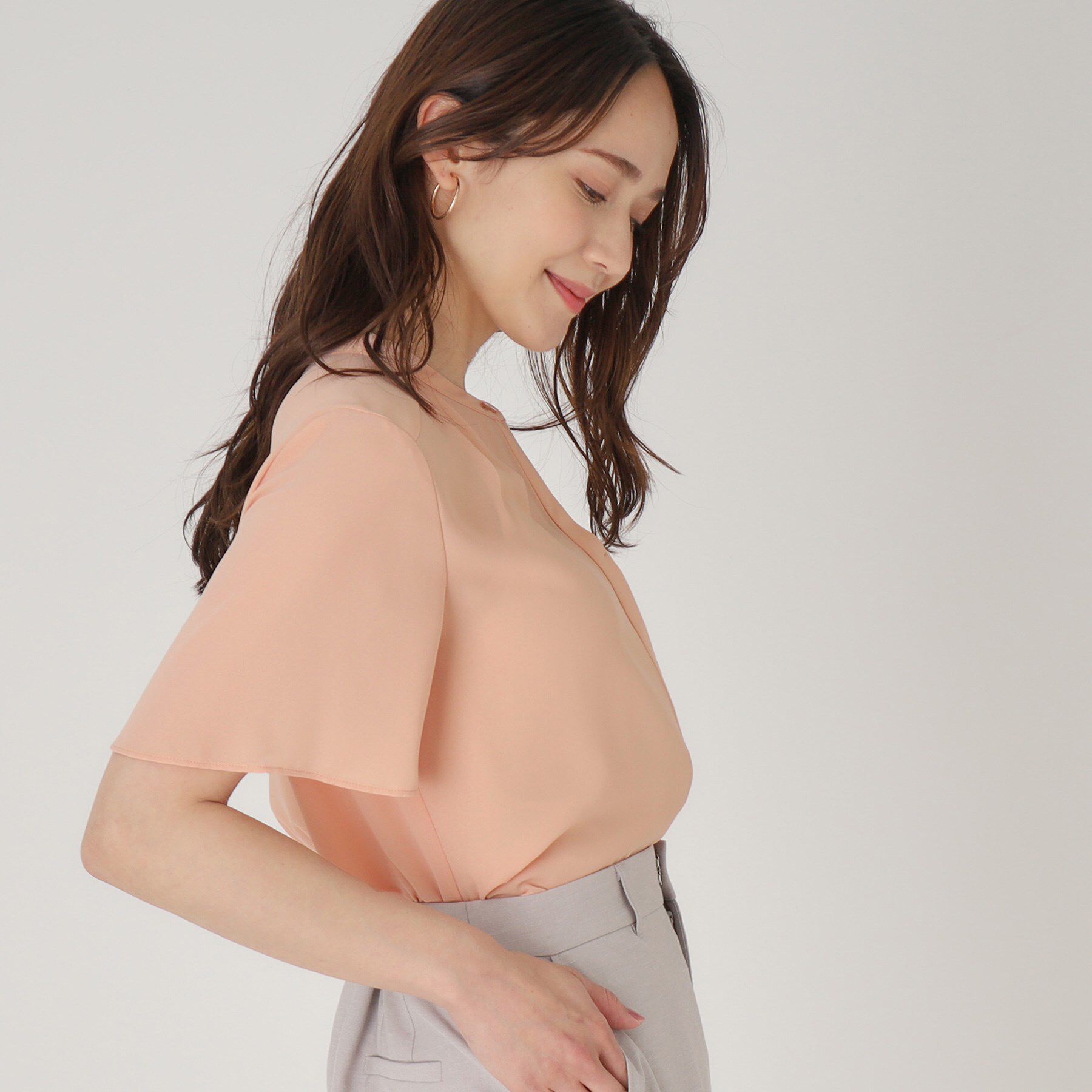 〇デザインポイント抜けすぎないクルーネックで今らしい印象に仕上げたブラウス。袖口の重ねデザインがポイントです。袖口が広がるタイプなので腕が細く見える.. |