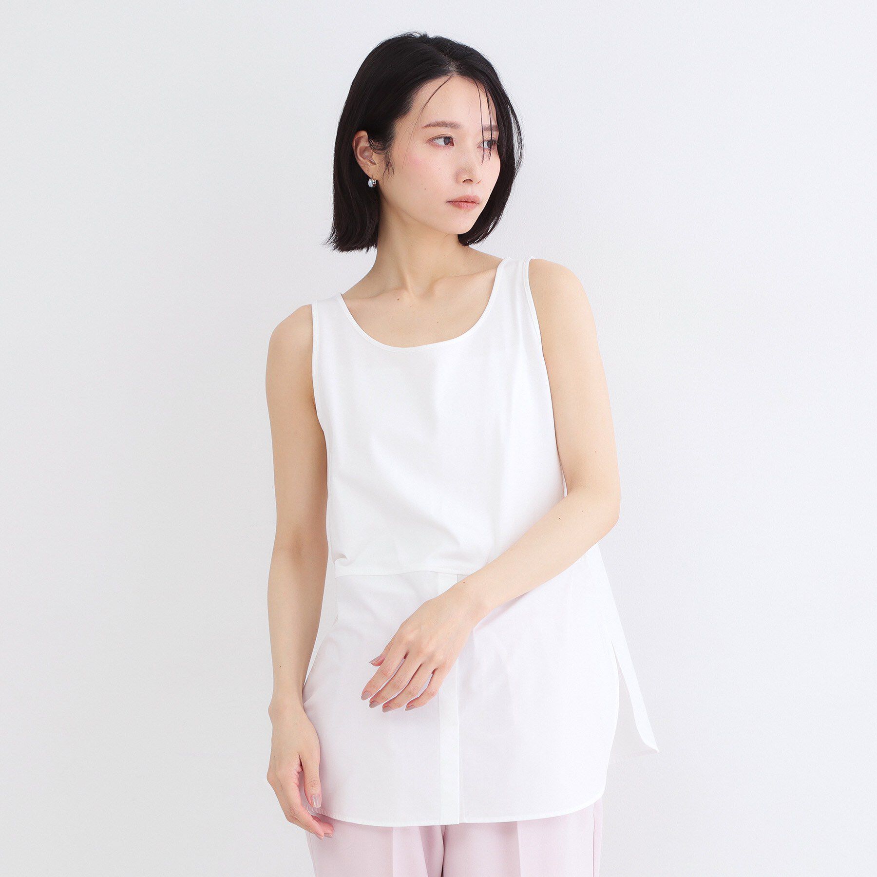 インナーに着るだけで簡単にレイヤードスタイルが完成!裾がシャツ素材で切り替えられた、重ね着用のインナータンクトップ【デザイン】・裾に布帛素材(001は.. |