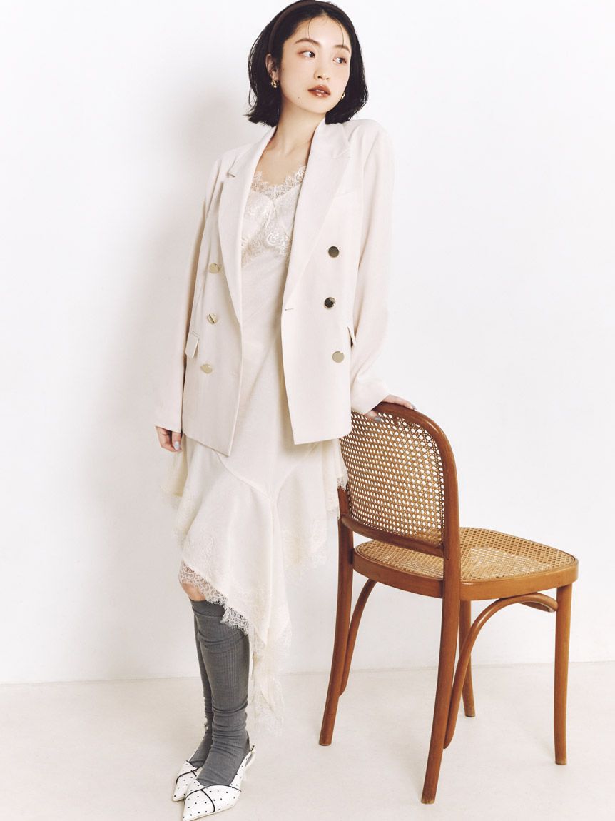 【2種類の丈感でお作りしているメタルボタンの美しいジレをキレイめスタイルに】【Design/Styling】艶感のあるメタルの小さなハーフトップボタンがアクセント.. |