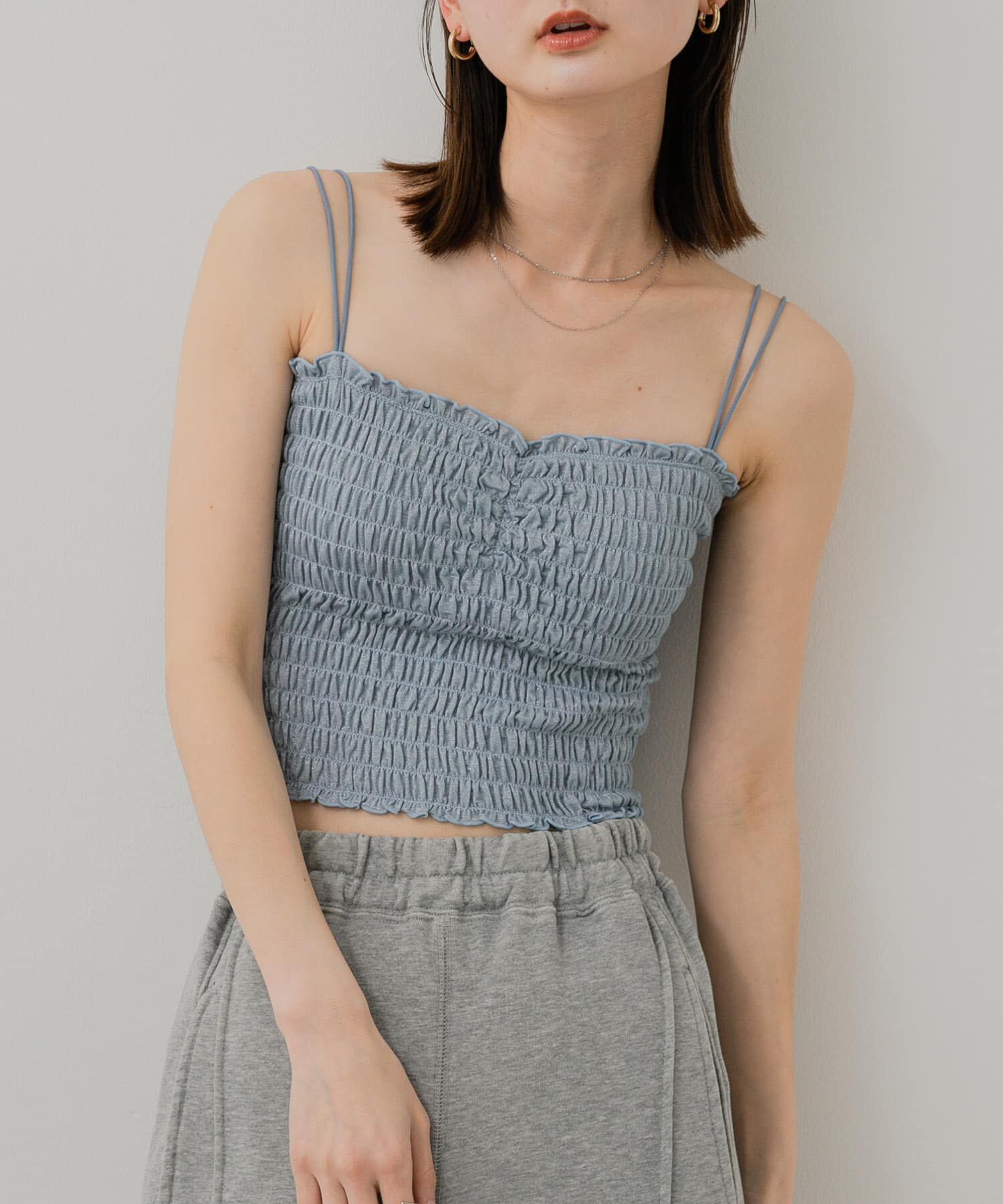 クロップド丈の主役キャミ!〇短めの着丈でスタイルアップ〇シャーリングのディテールがかわいい1枚〇ラメがキラキラしたカットソー素材が夏らしい1枚stylingカ.. |