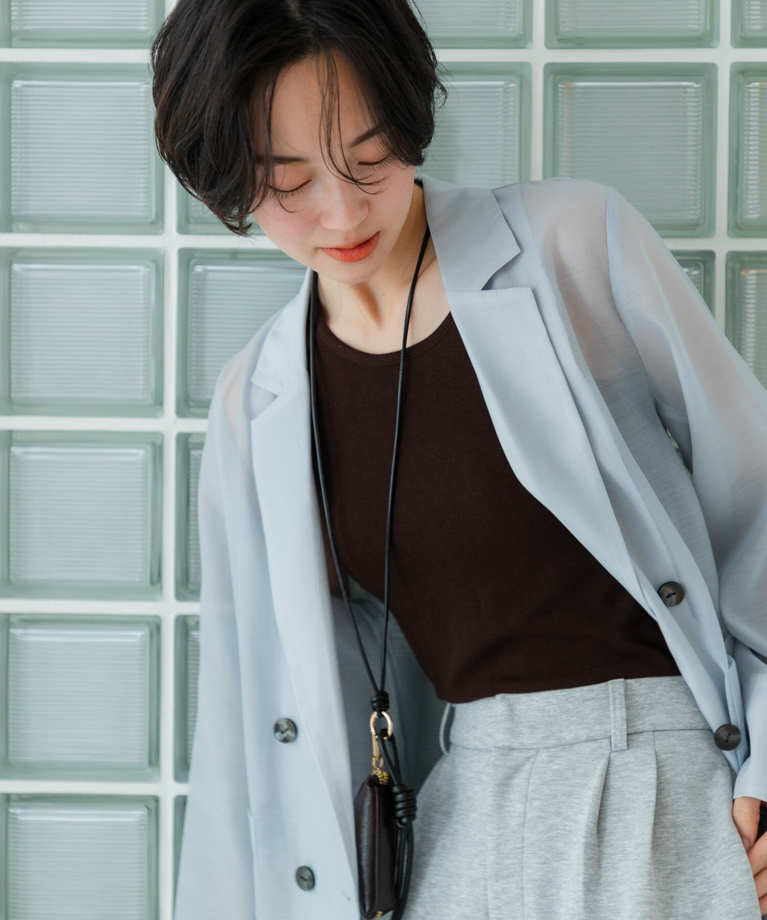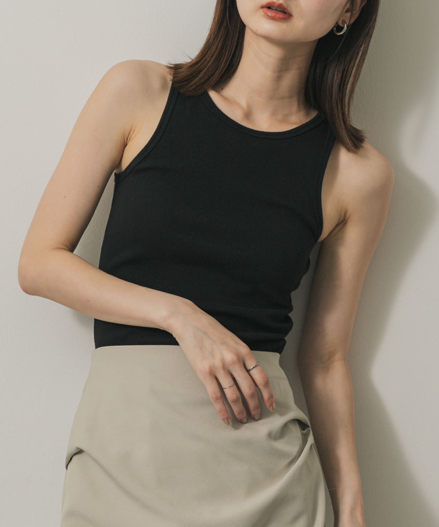 胸元にアクセントが入ったタンクトップ〇胸元のメタルプレートがアクセントに〇華奢な肩紐でスッキリ着用できます〇普通丈とクロップド丈の2サイズ展開styling.. |