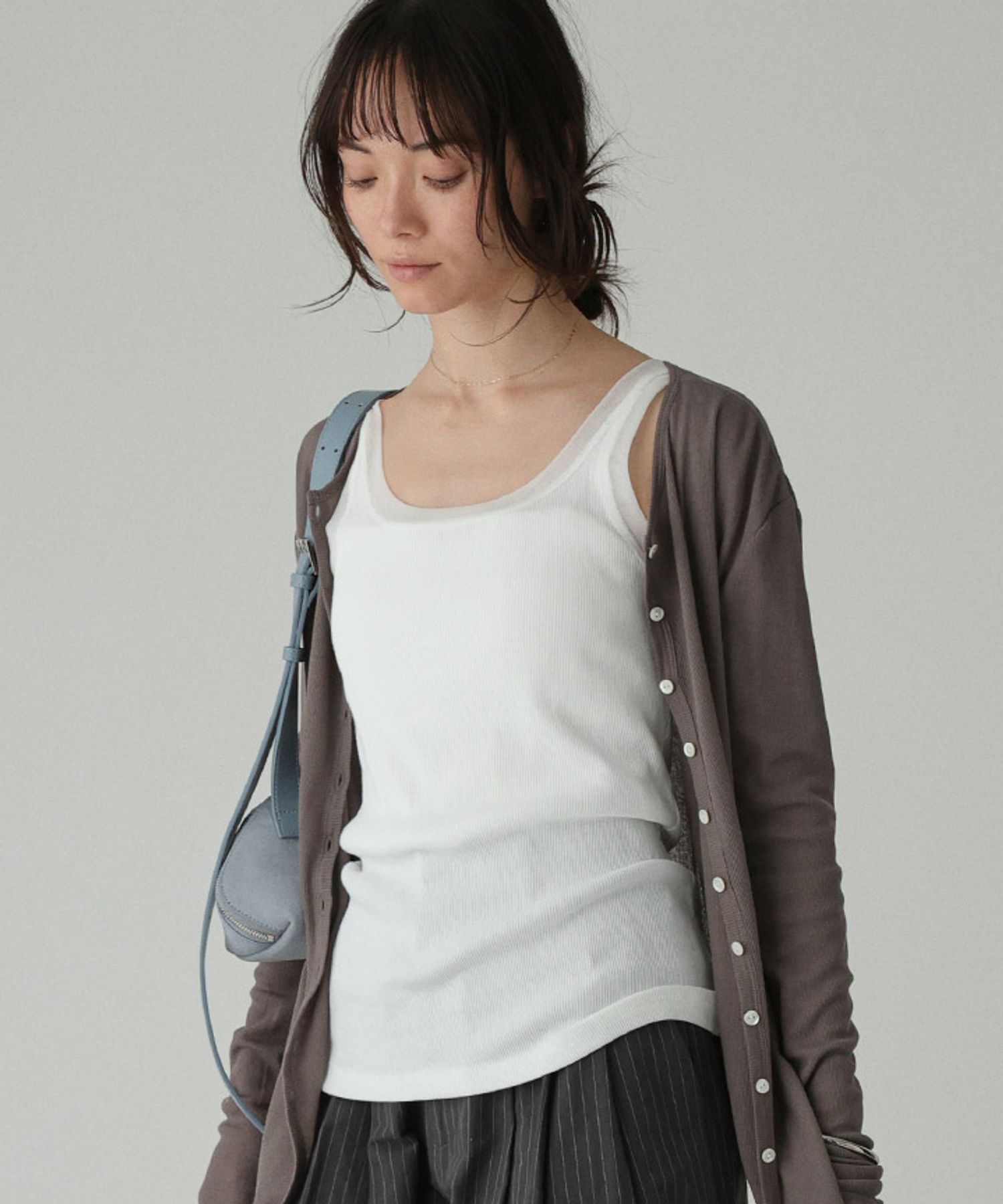 デイリーコーデの相棒に。大人フェミニンなタンクトップーーー◆DETAILポイント◆・襟ぐり、アームホールにチュールをパイピングしたRIBタンクトップ。・程よい.. |