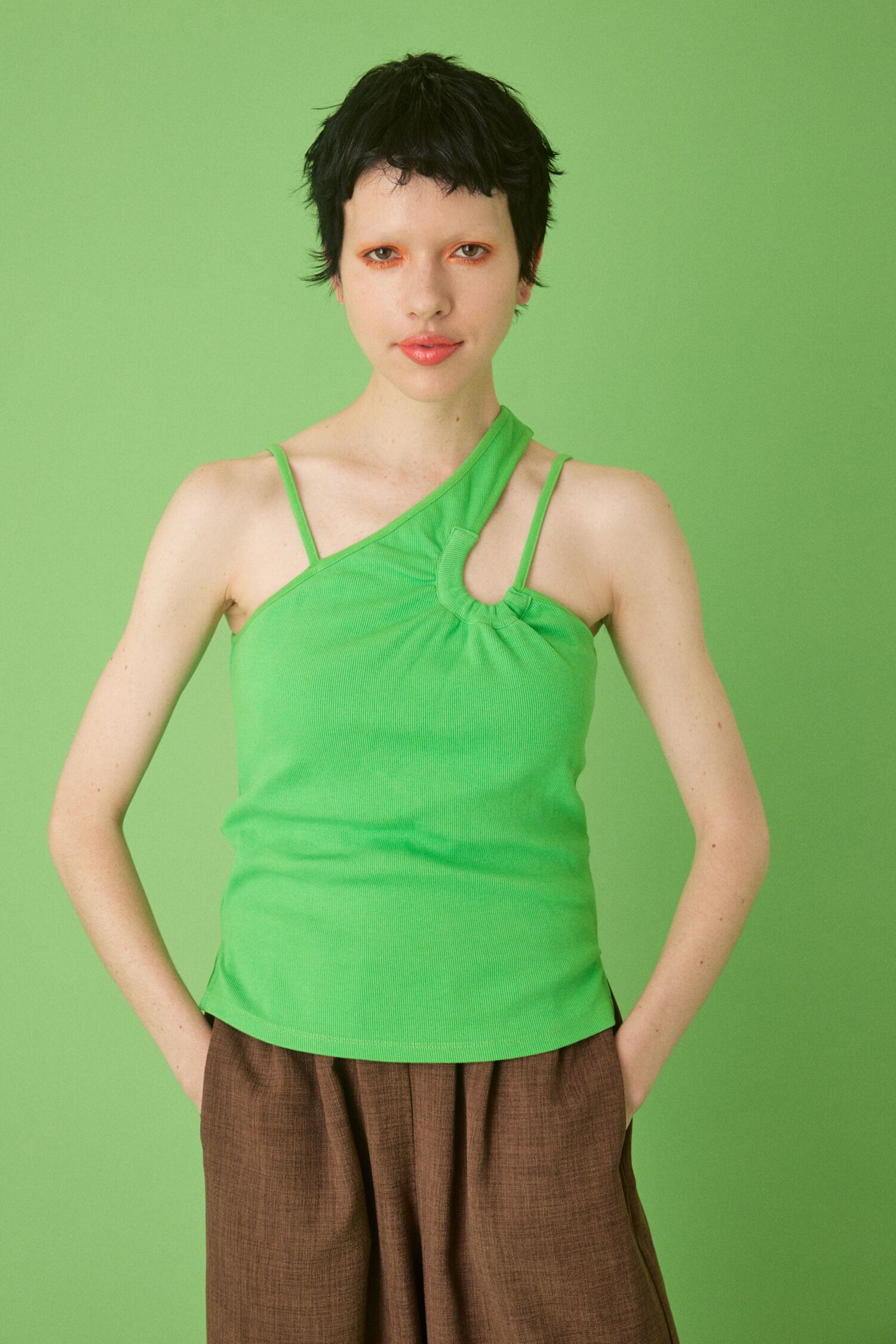 カップ付きのアシンメトリータンクトップ。アシンメトリーのカッティングが面白いデザイン性あふれる一枚で、シンプルになりがちな夏のスタイリングを楽しくし.. |