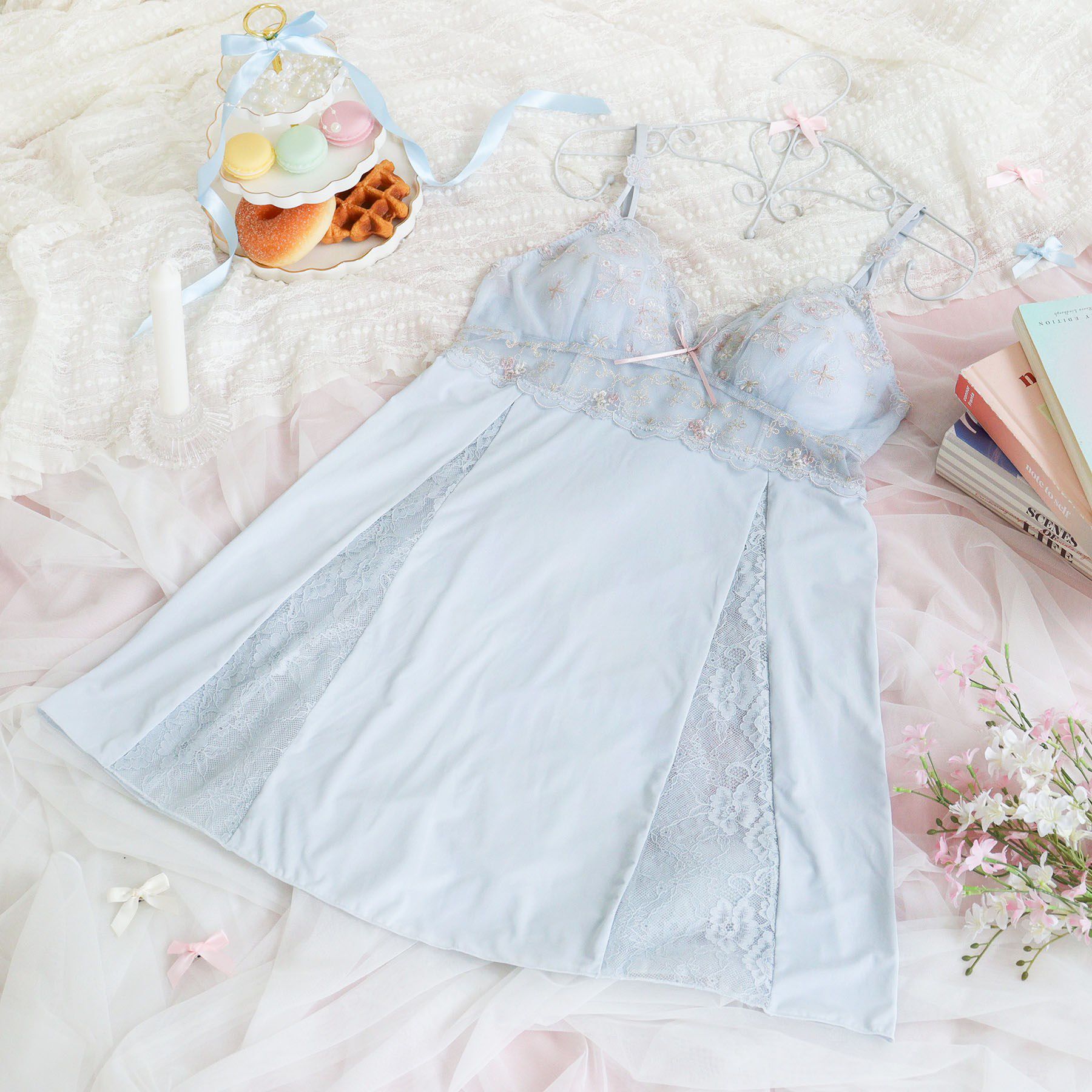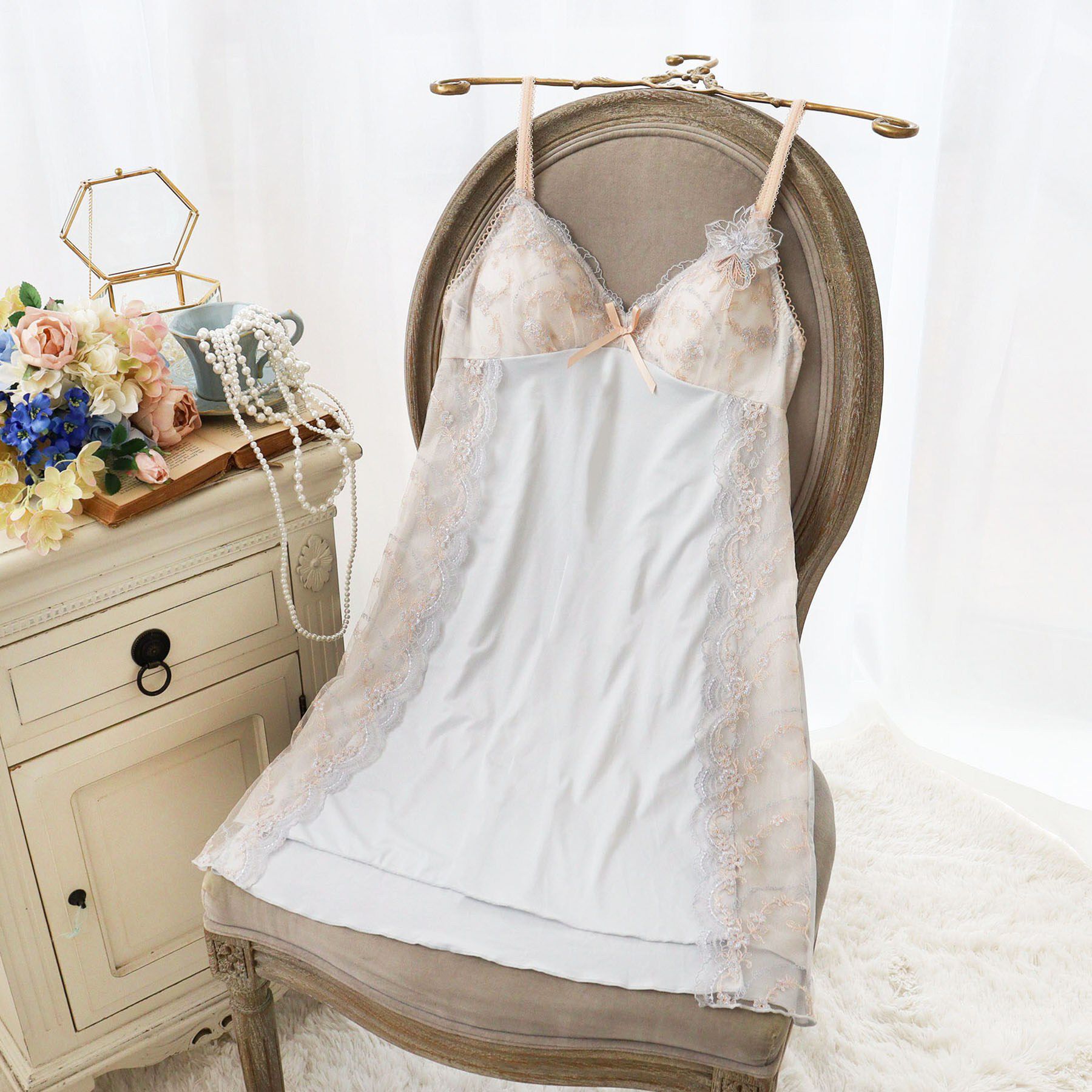 【心ときめくリラックスタイムを】レースをふんだんにあしらった、リサマリのルームコレクションから新カラーが登場。花柄ストレッチレースを胸元からバック部.. |