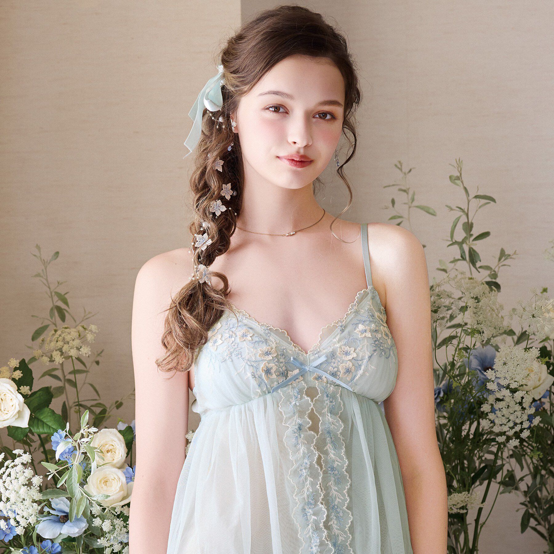 【ドレスをまとうランジェリー】風になびくドレスの裾をモチーフに、繊細な透明感のある基布をあしらったフェミニンなシリーズです。あえて単色にラメ糸のみを.. |
